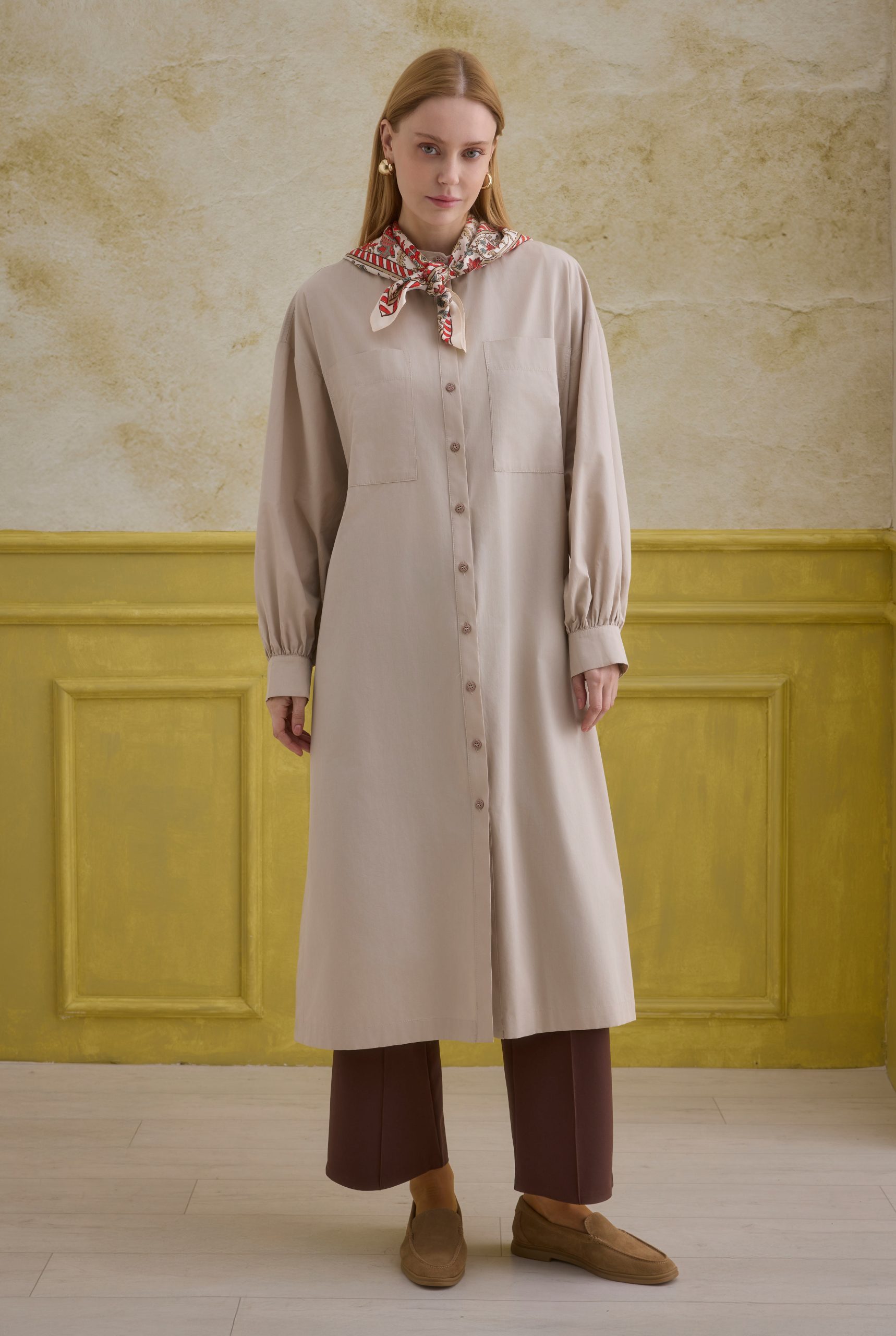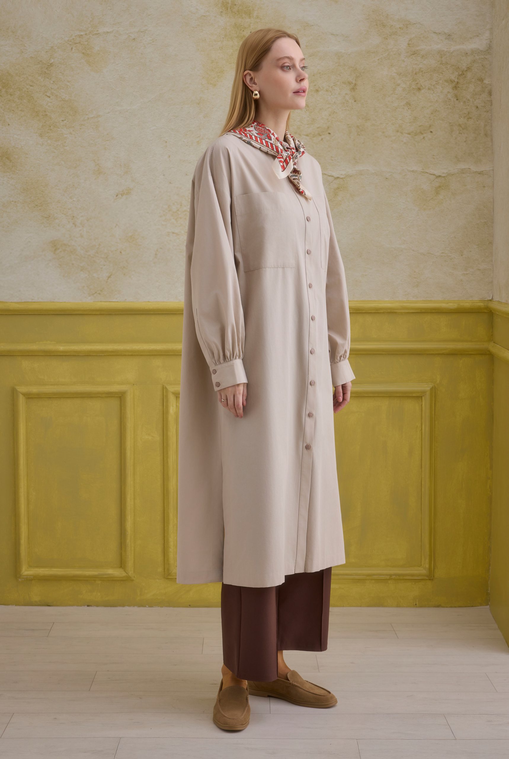 %100 pamuk iplikten üretilen bu uzun mandarin yaka tunik, tamamen doğal yapısıyla nefes alabilen, cilt dostu bir konfor sunar. Pamuk lifleri sayesinde gün boyu ferahlık hissi verirken şık bir görünümü korur.