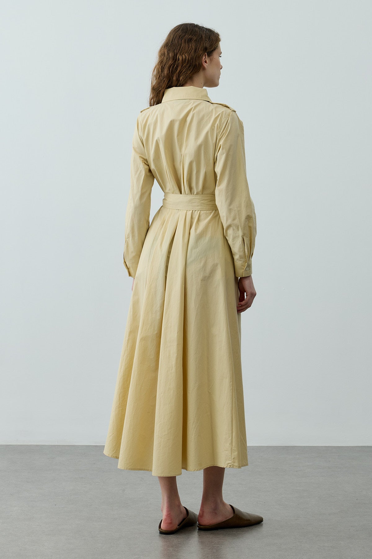 % 100 pamuk dokuma kumaştan, gömlek yakalı, önü patlı, düğme kapamalı, uzun kollu, manşetli, önü rüzgarlık detaylı, köprülü, kemerli, maxi boy elbise.