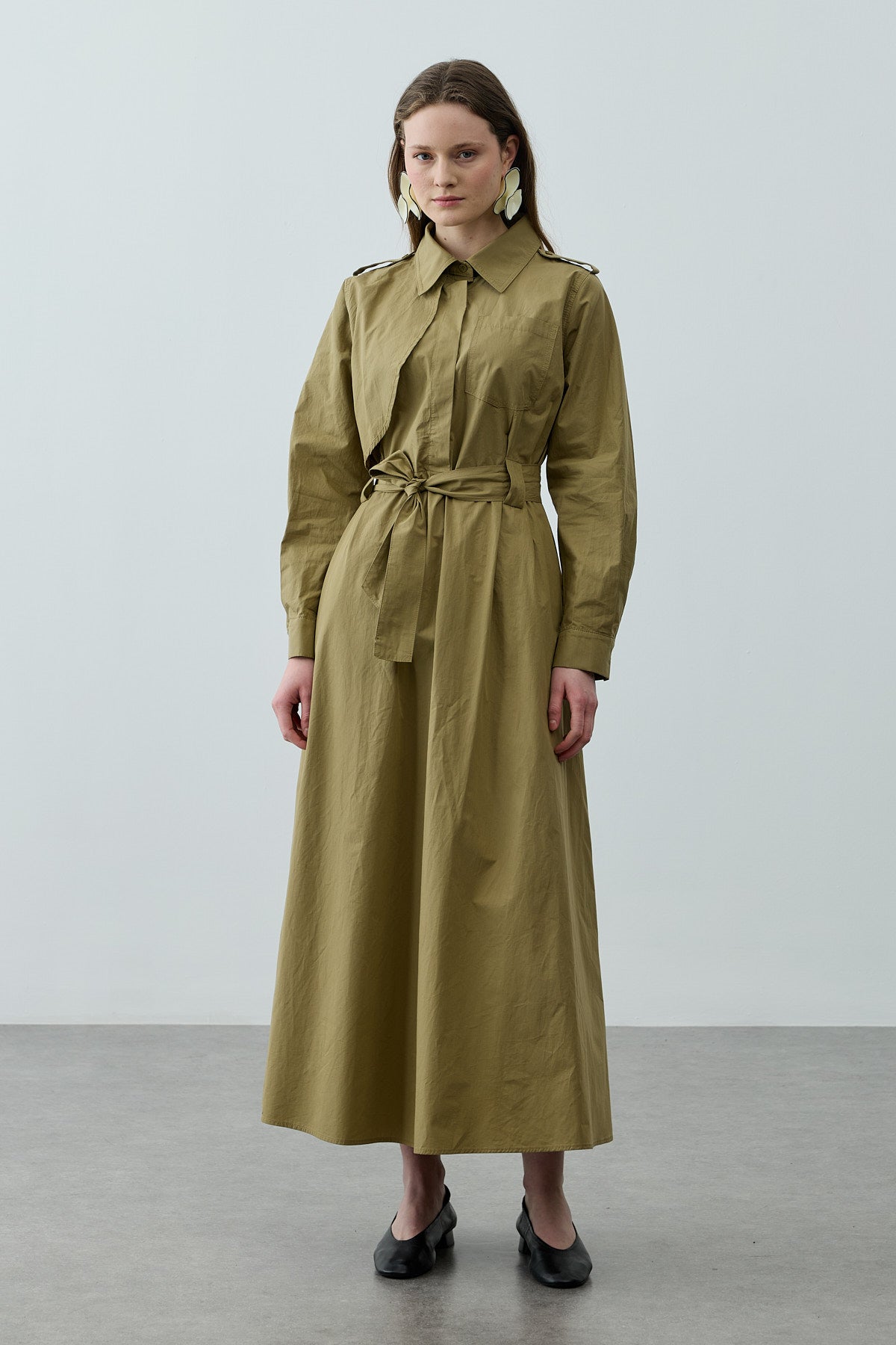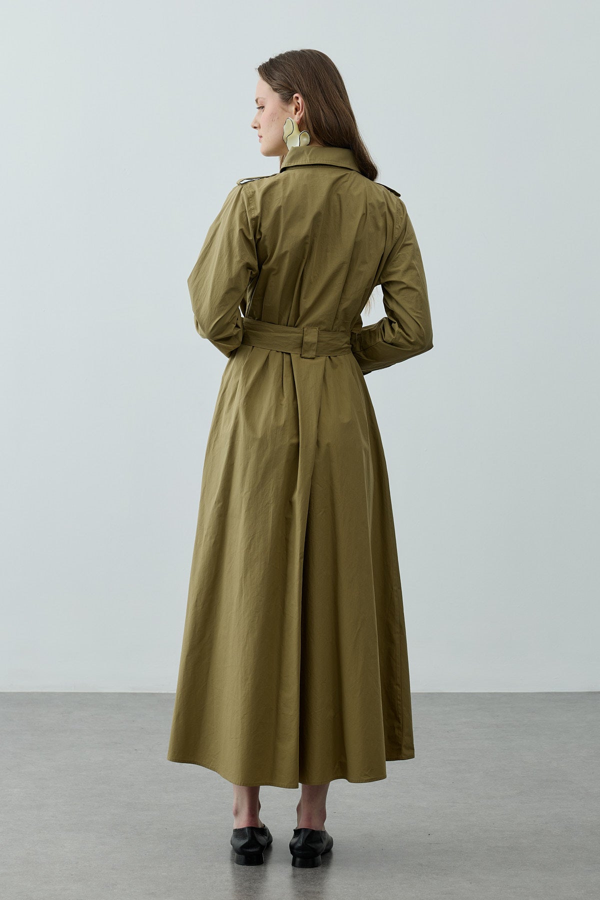 % 100 pamuk dokuma kumaştan, gömlek yakalı, önü patlı, düğme kapamalı, uzun kollu, manşetli, önü rüzgarlık detaylı, köprülü, kemerli, maxi boy elbise.