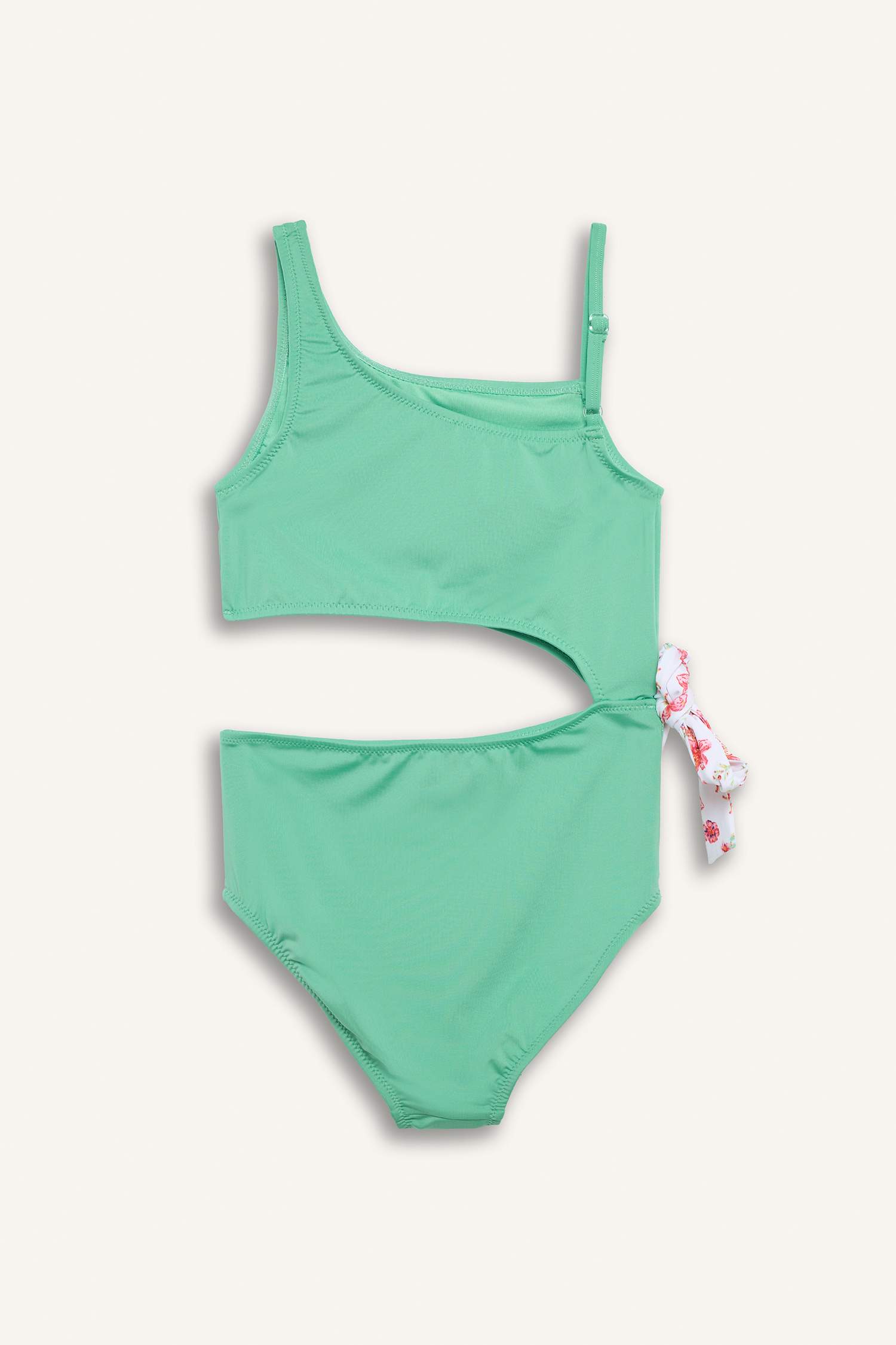 Tek omuz kesim mayo, şık ve modern tasarımıyla dikkat çeker. Canlı mint yeşili rengi ve çiçek desenli bağlama detayıyla enerjik bir hava katar. Rahat kesimi ve kaliteli kumaşı sayesinde deniz ve havuz keyfini konforlu hale getirir.