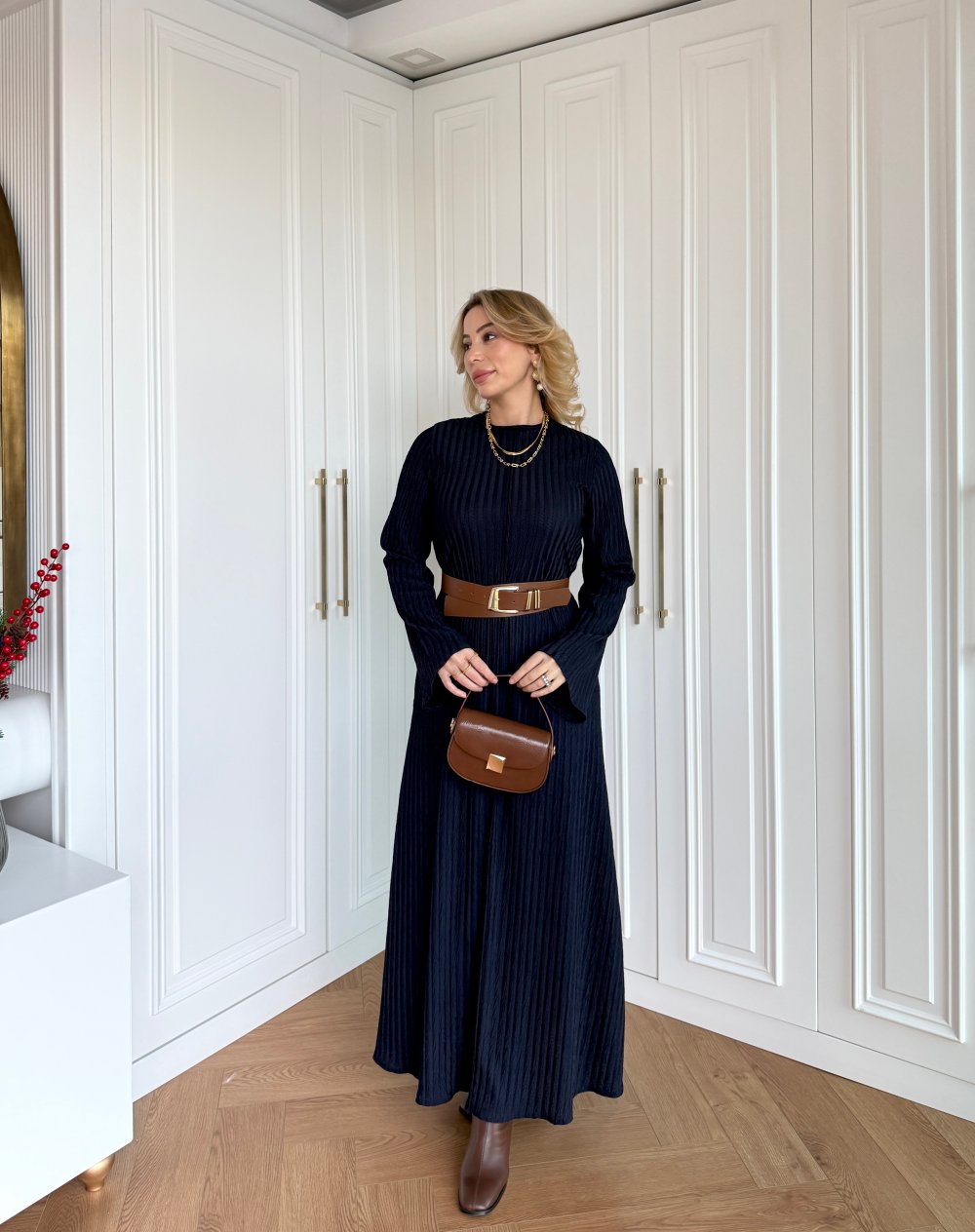 Elbise, 1. sınıf parlak efektli örme triko kumaştan üretilmiştir. Çıkarılabilir kemer detayına sahiptir. Bisiklet yaka tasarımı ve yaka arkasından fermuarlıdır. Boy: 146cm, Omuz: 41cm, Göğüs: 49cm