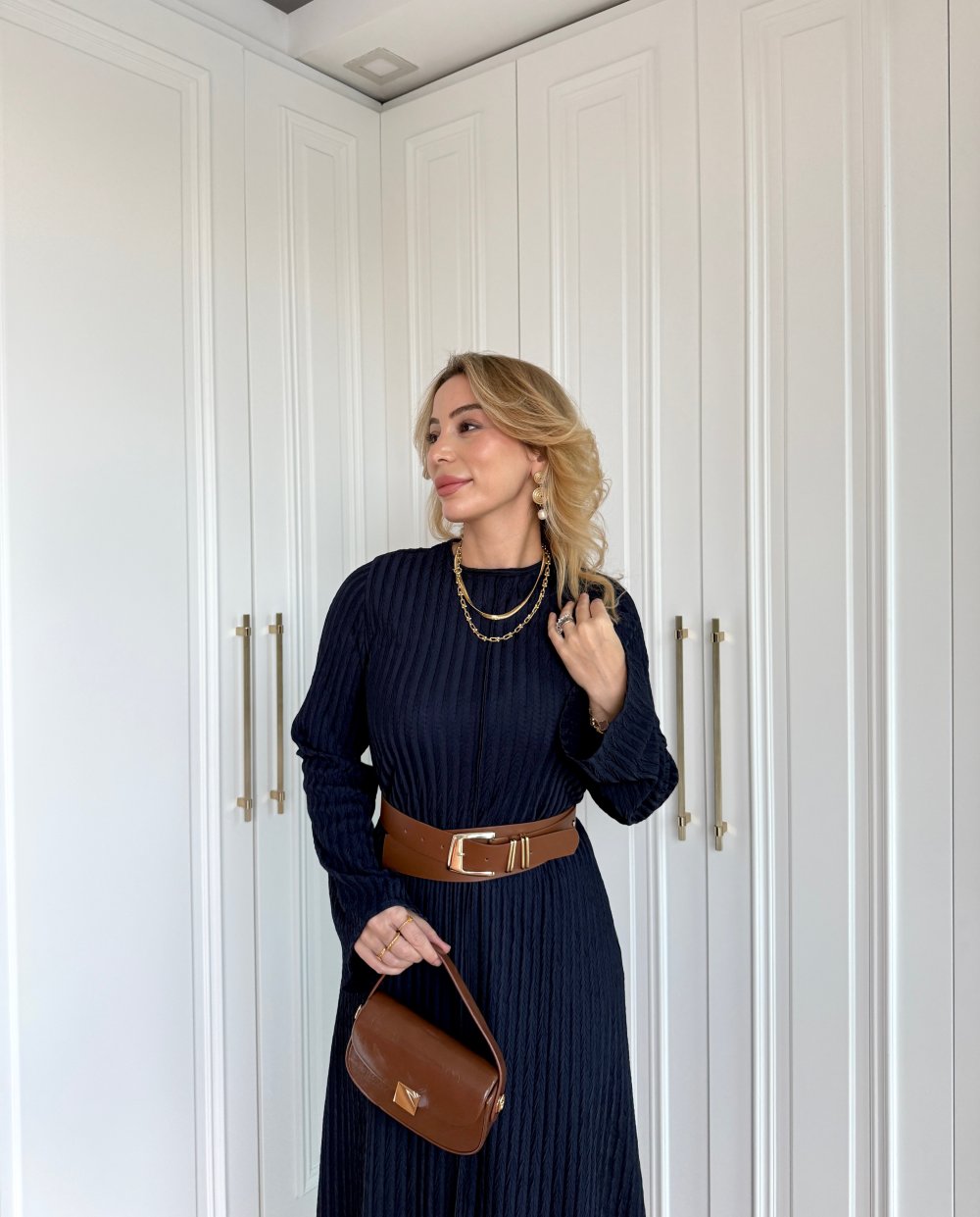 Önlüklü Koyu Lavanta Mavisi Elbise