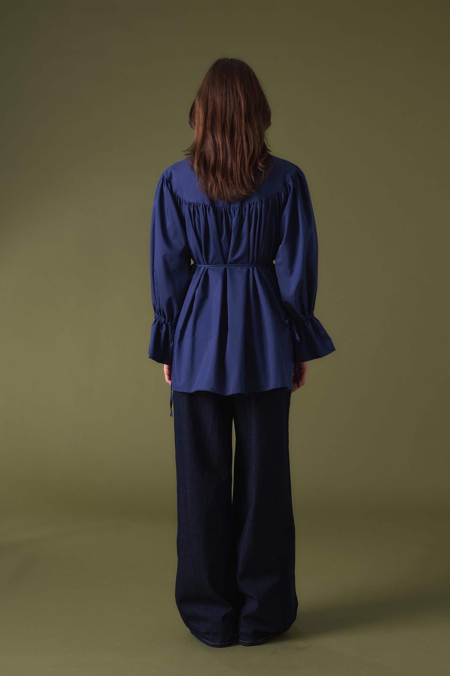 Bej Fırfırlı Yaka Bağlamalı Uzun Gömlek
