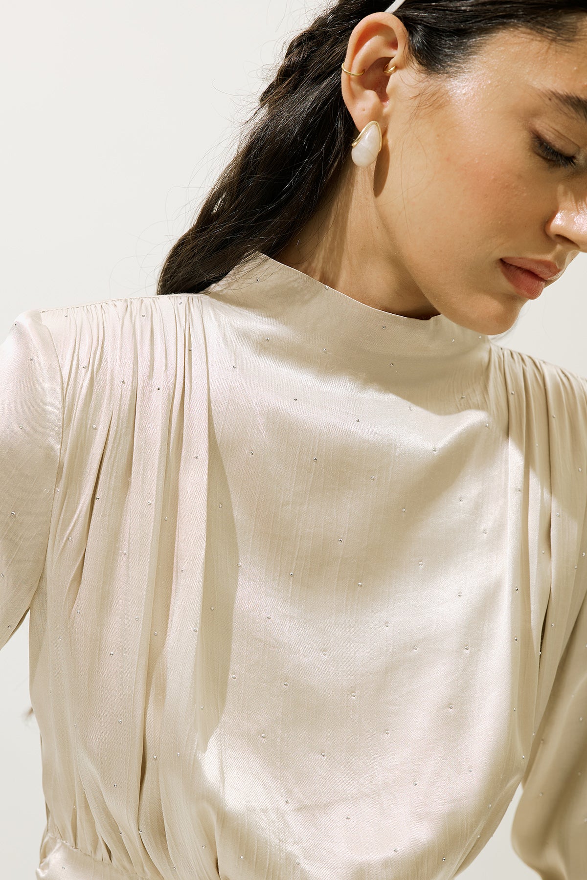Işıltılı saten dokusuyla asil bir duruş sergileyen bu abiye, zarif kesimi ve inci detaylı kemeriyle şıklığı en sade haliyle yansıtıyor. Davetlerde ve özel günlerde sofistike bir görünüm arayanlar için ideal bir seçim.