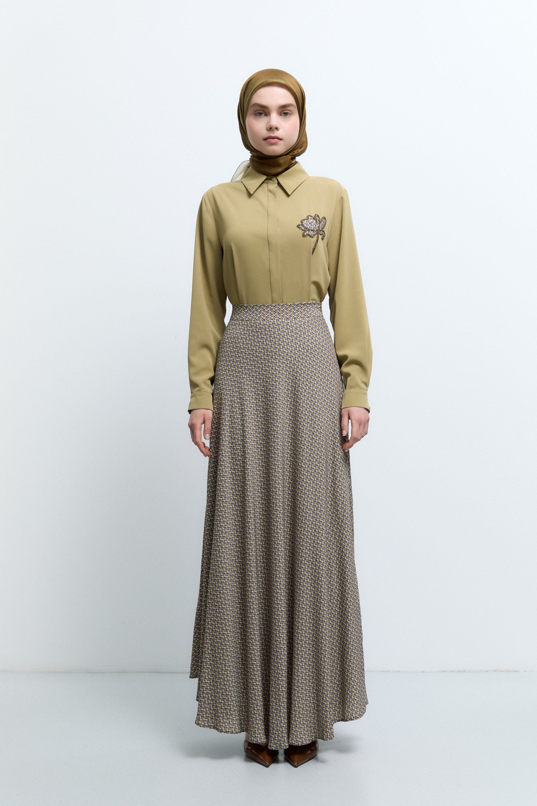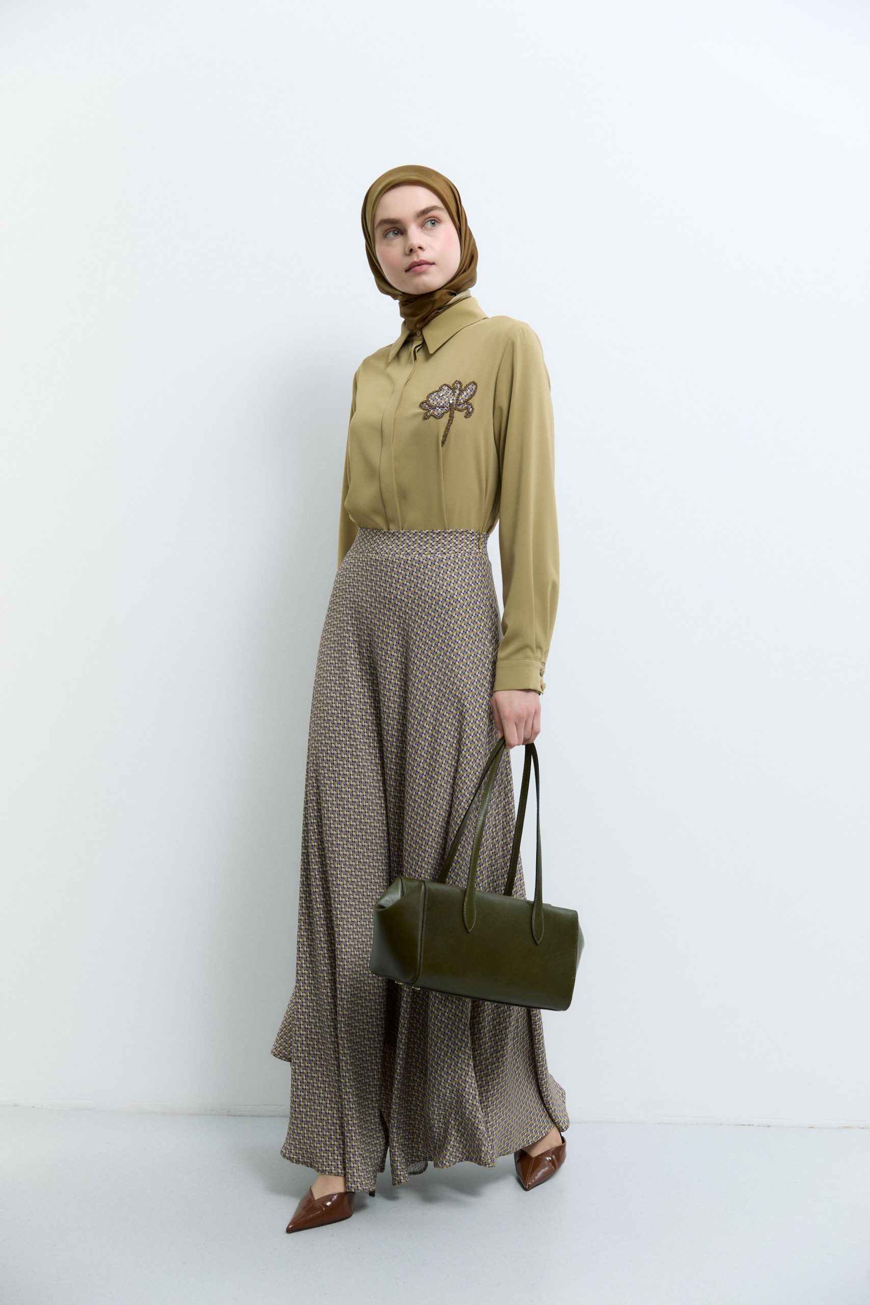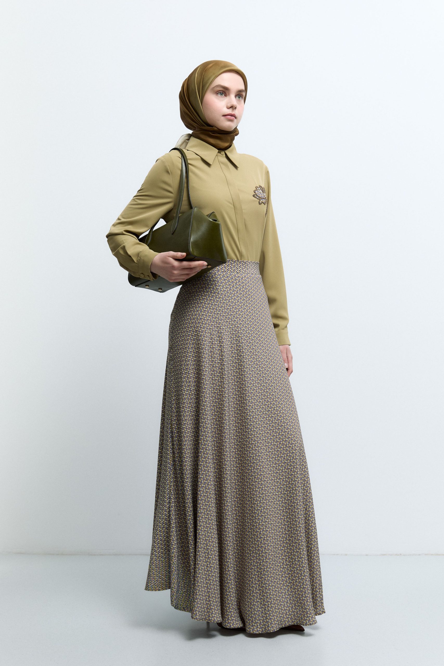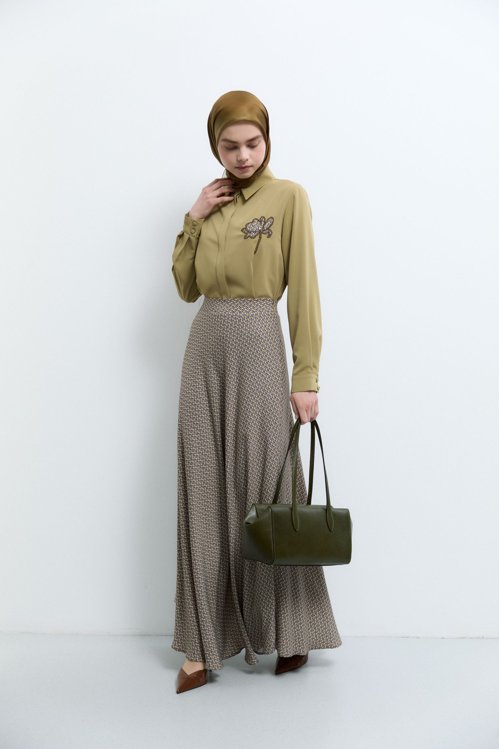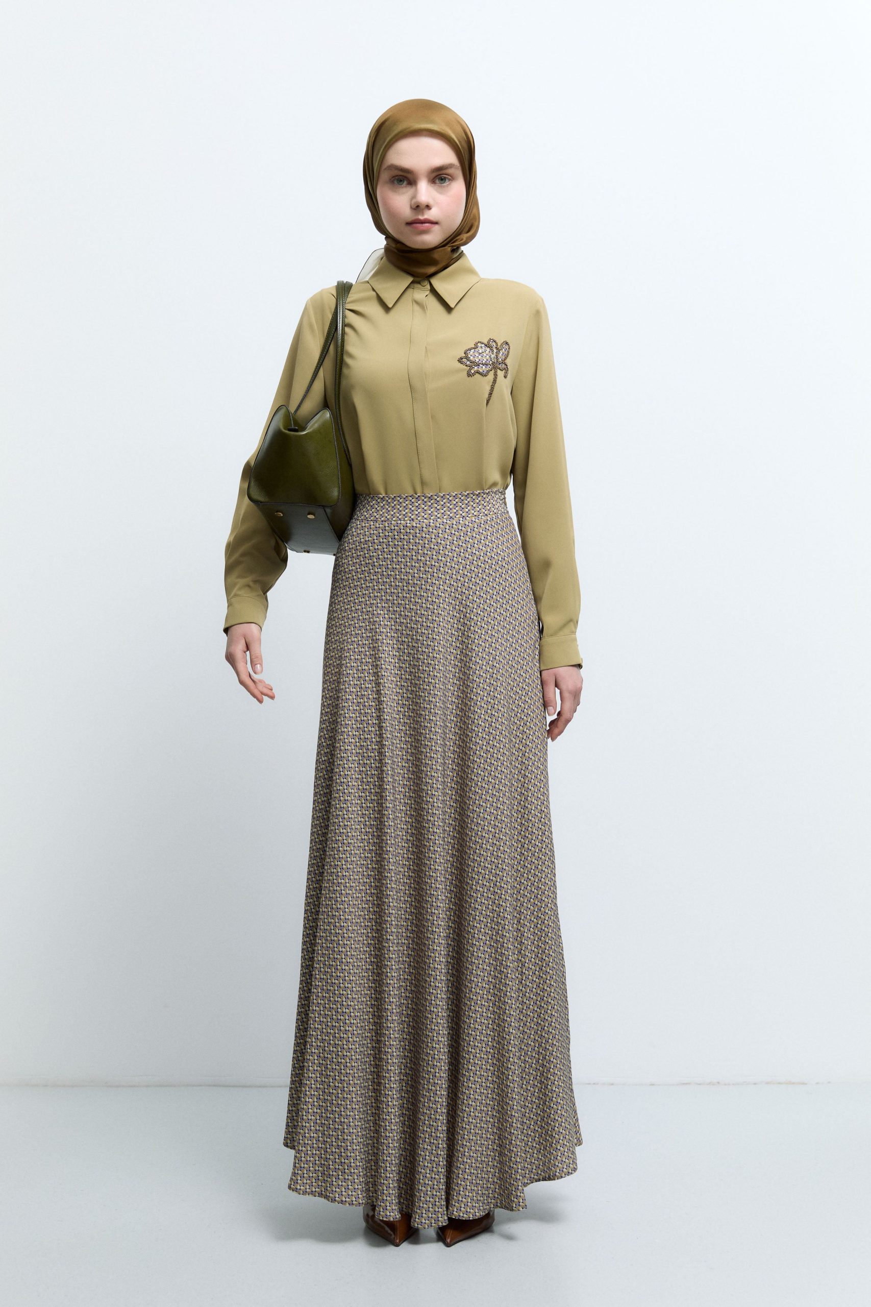 Mini Geometrik Desenli Etek – Olive