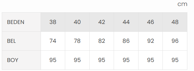 Beden Tablosu: {‘BEDEN’: [’38’, ’40’, ’42’, ’44’, ’46’, ’48’], ‘BEL’: [74, 78, 82, 86, 92, 96], ‘BOY’: [95, 95, 95, 95, 95, 95]}