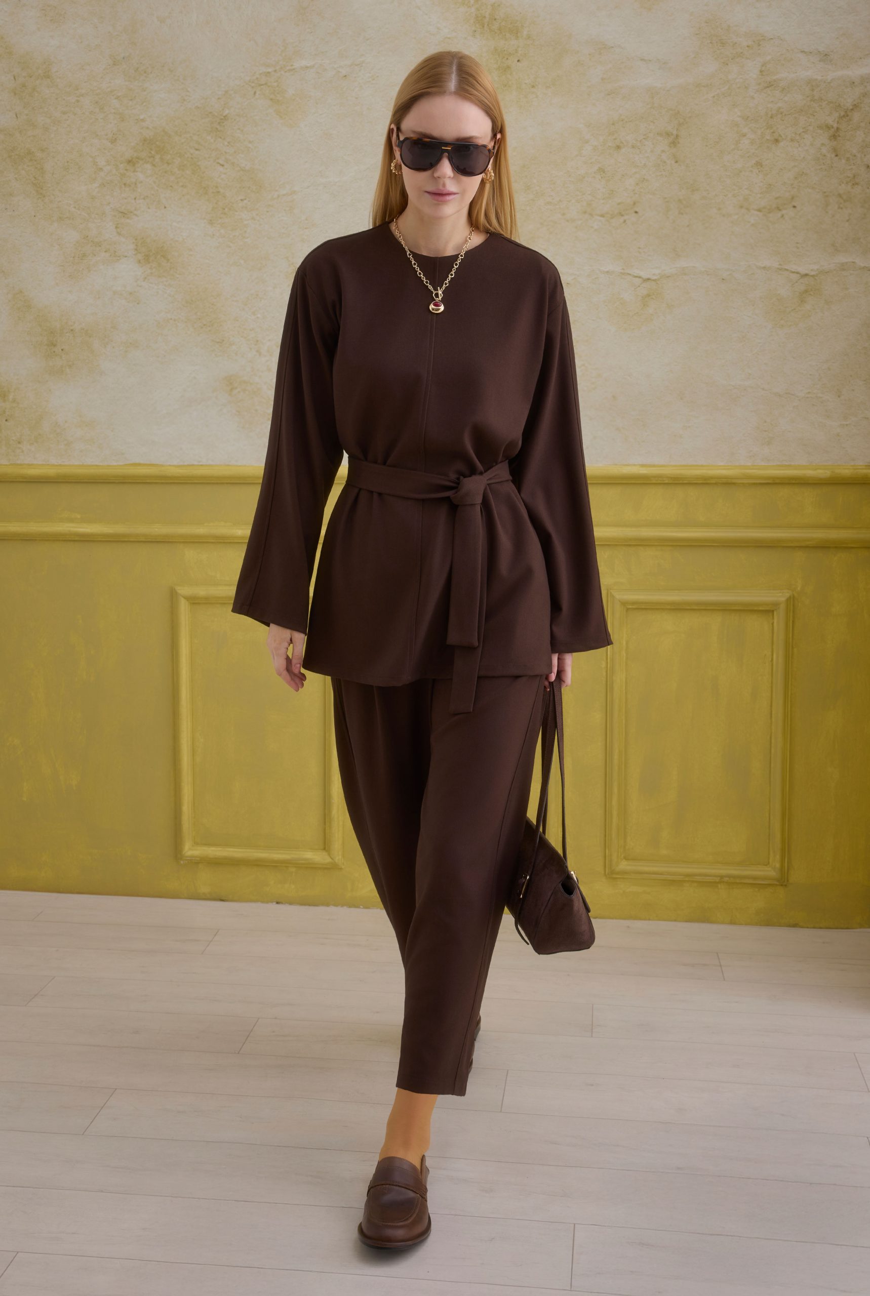 Modern ve minimalist tasarımıyla bu set, rahat kesimi sayesinde hem şıklık hem de kolaylık sunar. Temiz ve sade çizgileri zamansız bir görünüm yaratırken gün boyu konforu korur.