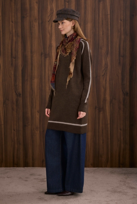 Uzunluk: 85 cm (Ürün uzunluğu üretimler arasında 1–5 cm değişiklik gösterebilir. Bu uzunluk ölçüsü ürün düz zemine serilerek alınmıştır. Örgü kumaşın yapısı gereği, giyildiğinde aşağı doğru esner ve 5–8 cm daha uzun görünür.)