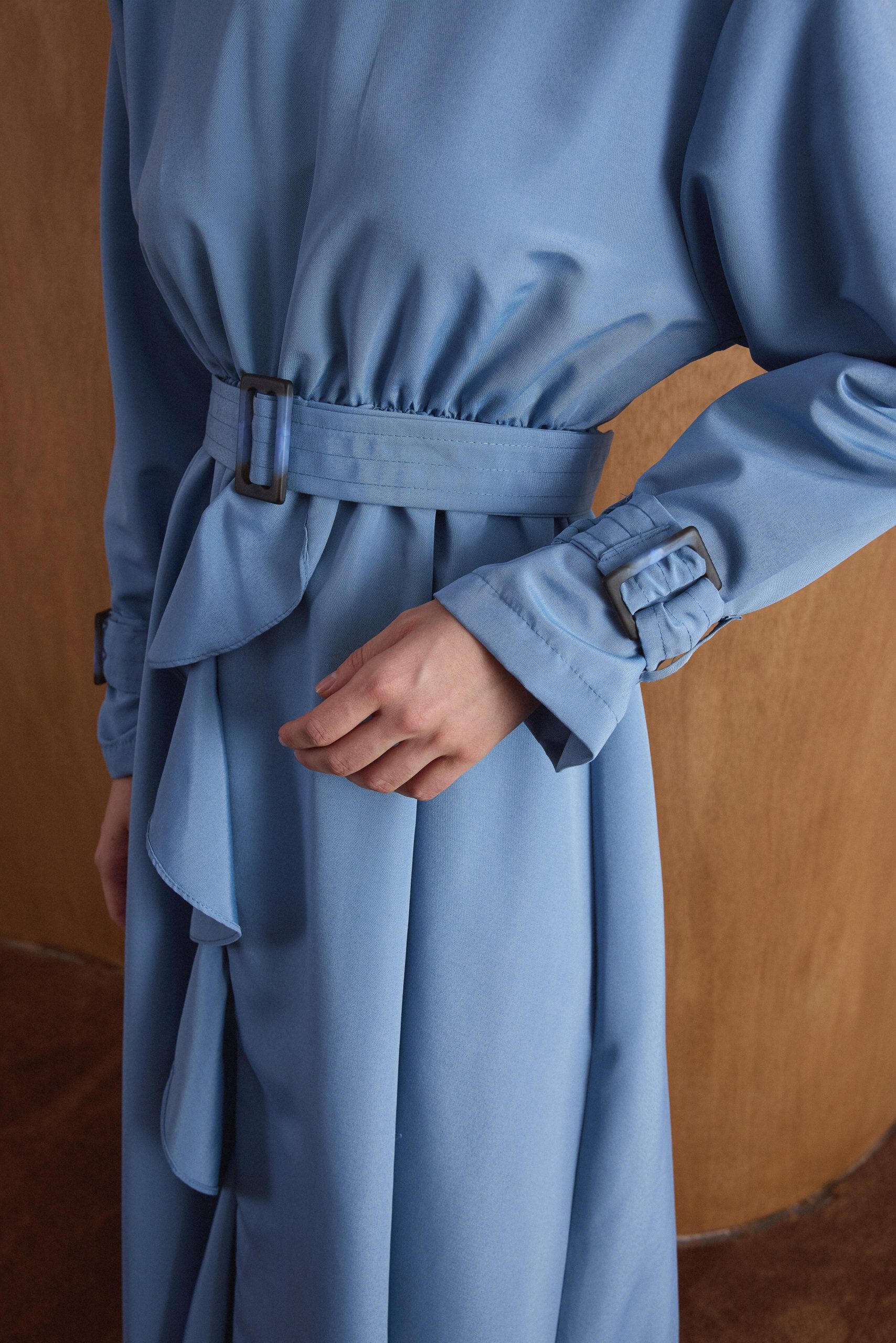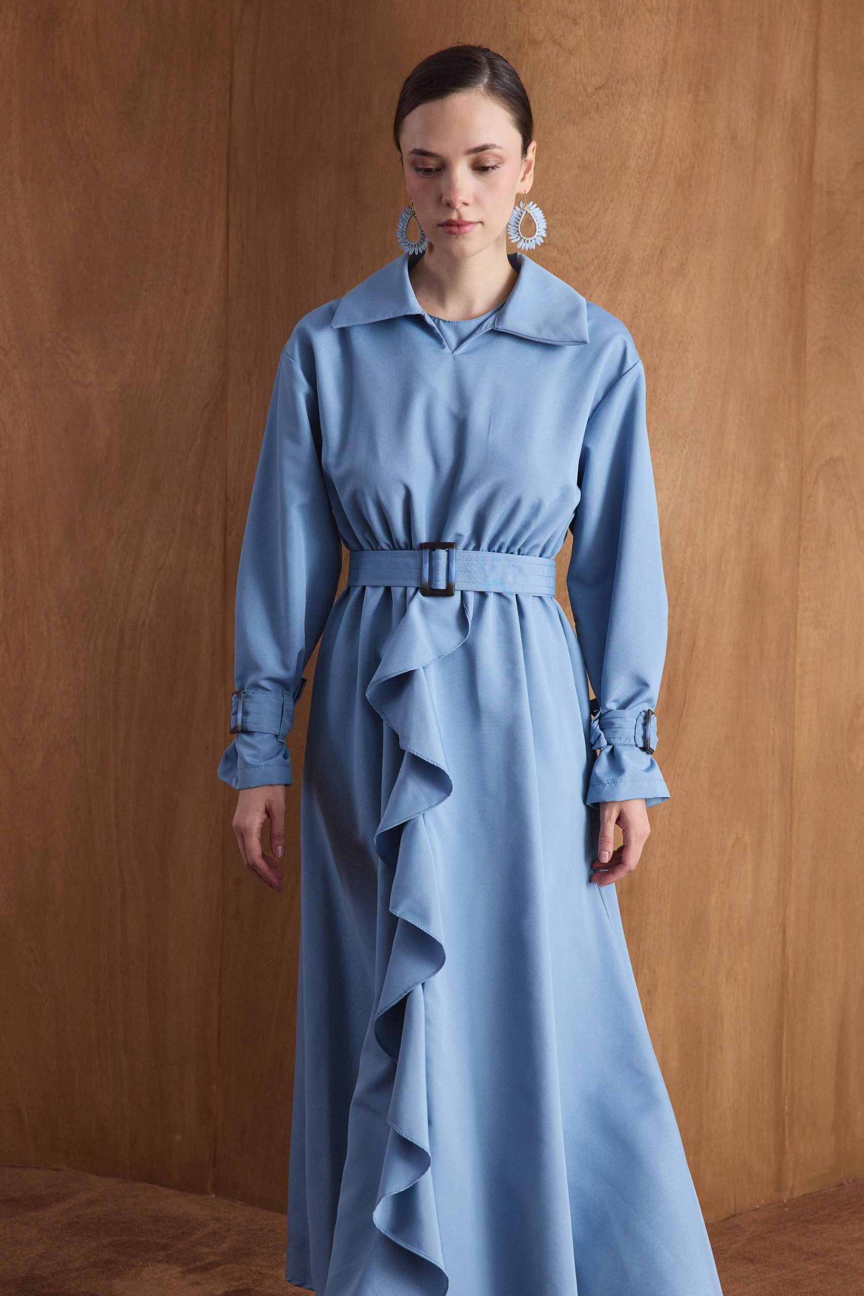 Detay: Kuşaklı bel, volanlı ön detay, bilek manşetli uzun kol