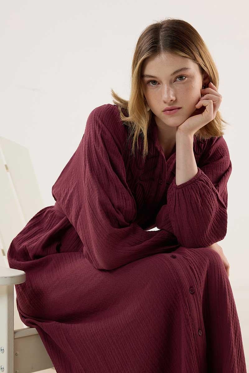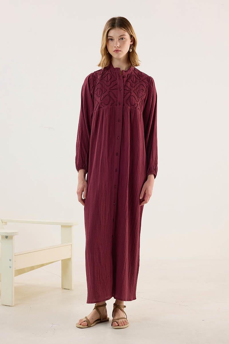 Nakışlı Müslin Elbise Bordo