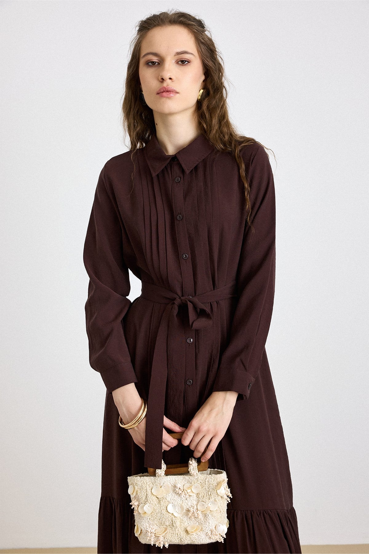 Kahve elbise, nervür detayları ve fırfırlı etek tasarımıyla zarif ve hareketli bir görünüm sunar. Soft kumaşı sayesinde konforlu bir kullanım sağlar. Günlük şık elbise, rahat elbise ve modern stil arayanlar için öne çıkan bir modeldir.
