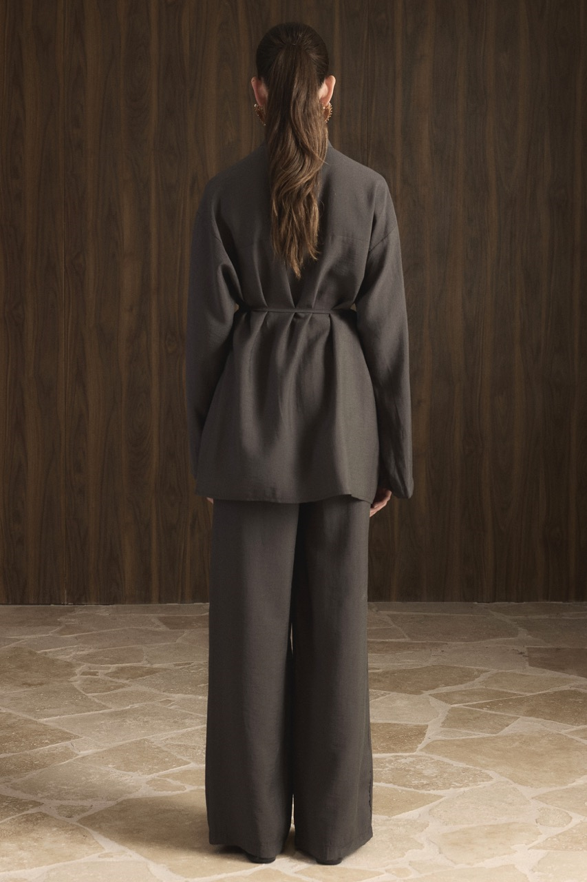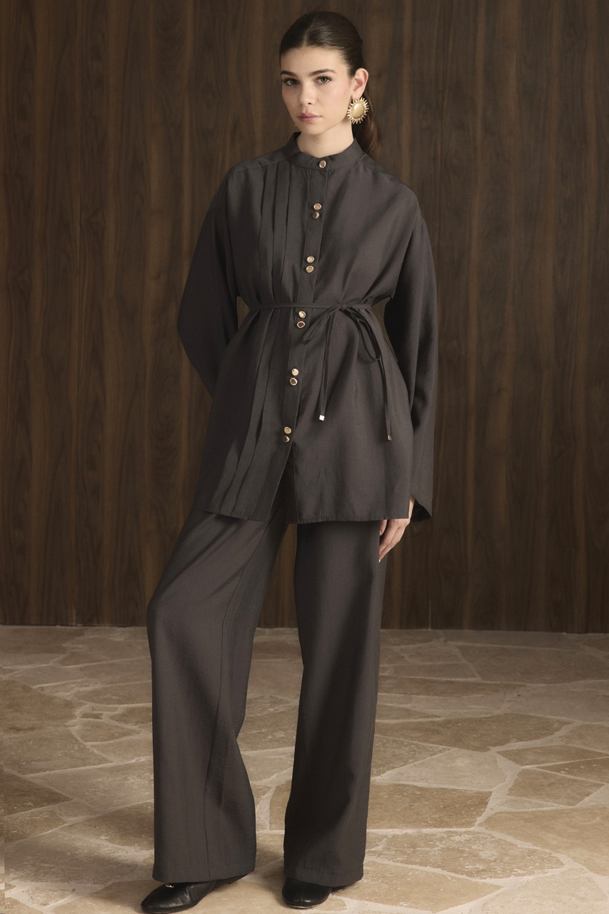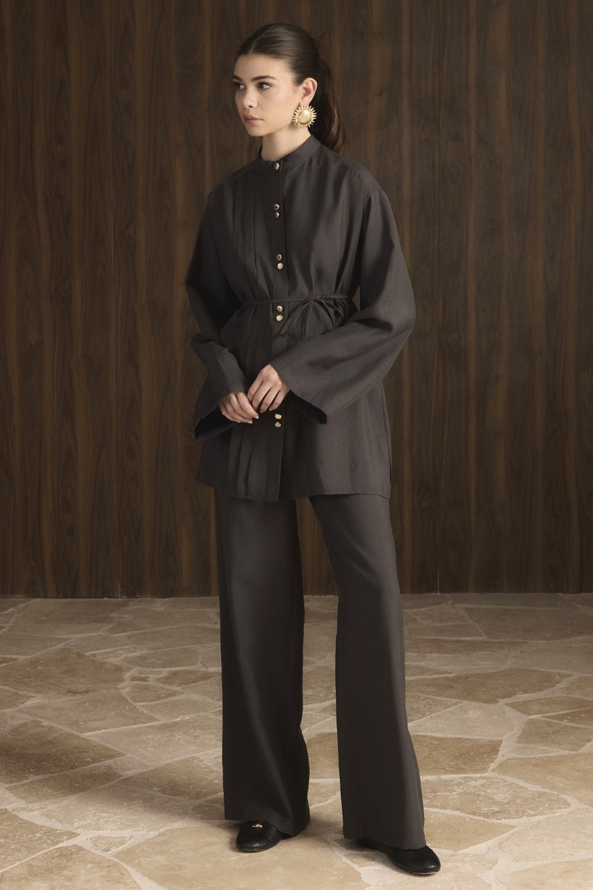 Kapitone dokusuyla sıcaklık ve yapı kazanan bu takım, ceket ve etek uyumuyla sofistike bir siluet oluşturur. Modern kesimiyle şehir stiline zarif bir dokunuş katarken, rahat kalıbı sayesinde gün boyu konfor sağlar.