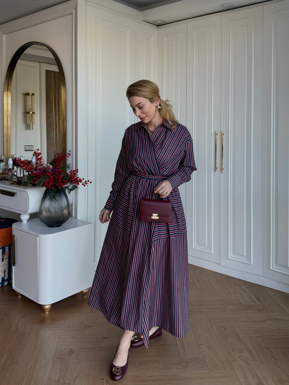Fiyonk Detay Çizgili Astarlı Elbise – Ekru