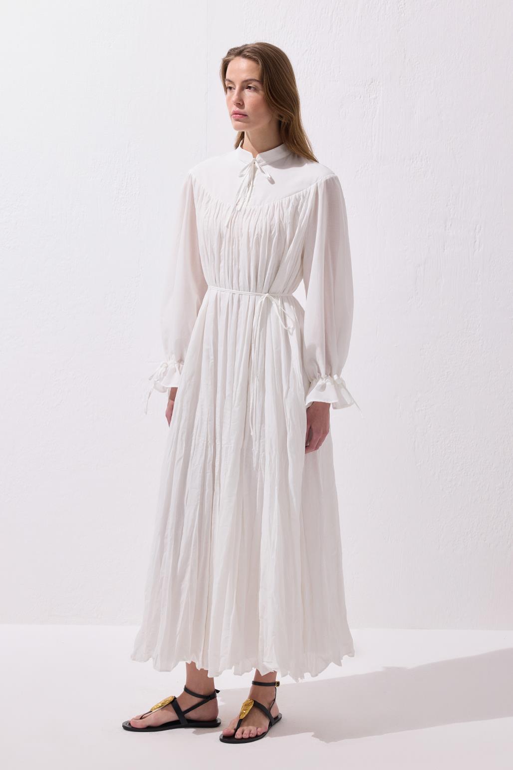 Odri Vual Kraş Uzun Elbise Ekru, modern tasarımı ve zarif kesimiyle her gardıroba gereken şıklığı ve rahatlığı katıyor. Krash efektli vual kumaş, hem hafifliğiyle hem de zarif yapısıyla gün boyu rahatlık sunarken, vücuda oturan tasarımı her adımda şıklığınızı ortaya çıkarır.Düşük omuz detayı, elbisenin zarif duruşunu güçlendirirken, ayarlanabilir kol uçları ve seyyar biye kemeri, bedeninizi mükemmel bir şekilde sarar. Dik yaka ve roba kesik detayları, tasarıma modern bir dokunuş eklerken, özel günlerde ya da gündelik stilinizde rahatlıkla tercih edilebilecek bir seçenek haline gelir. Özel kumaş yapısı ve şık detaylarıyla dolabınızın vazgeçilmezi olacak!