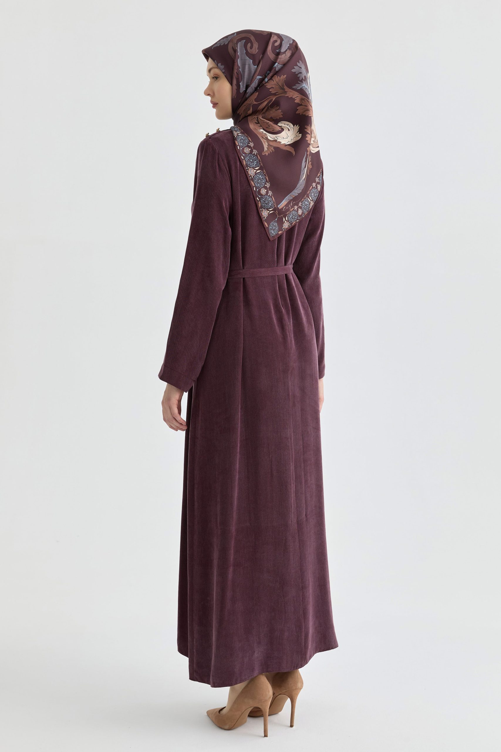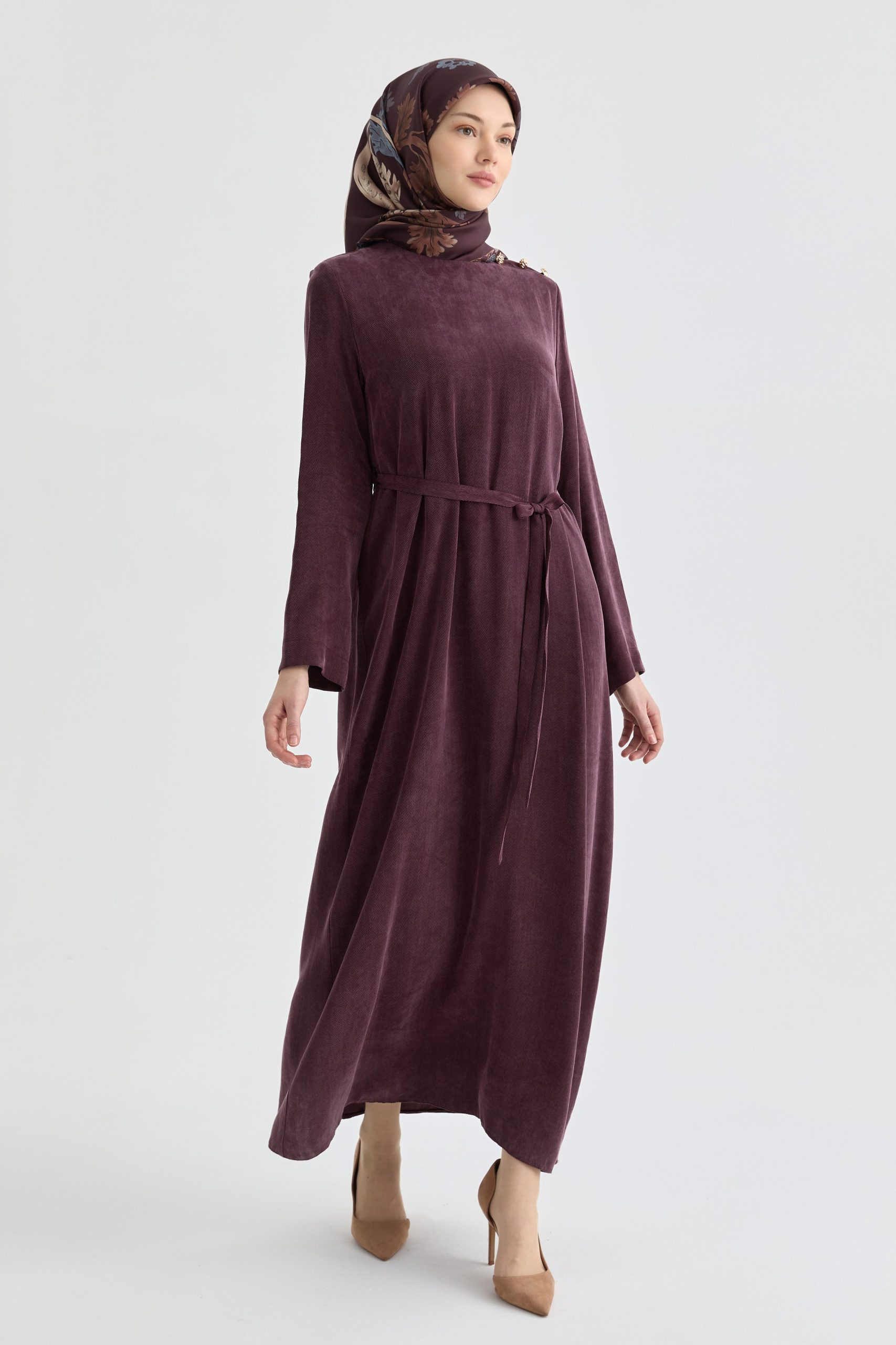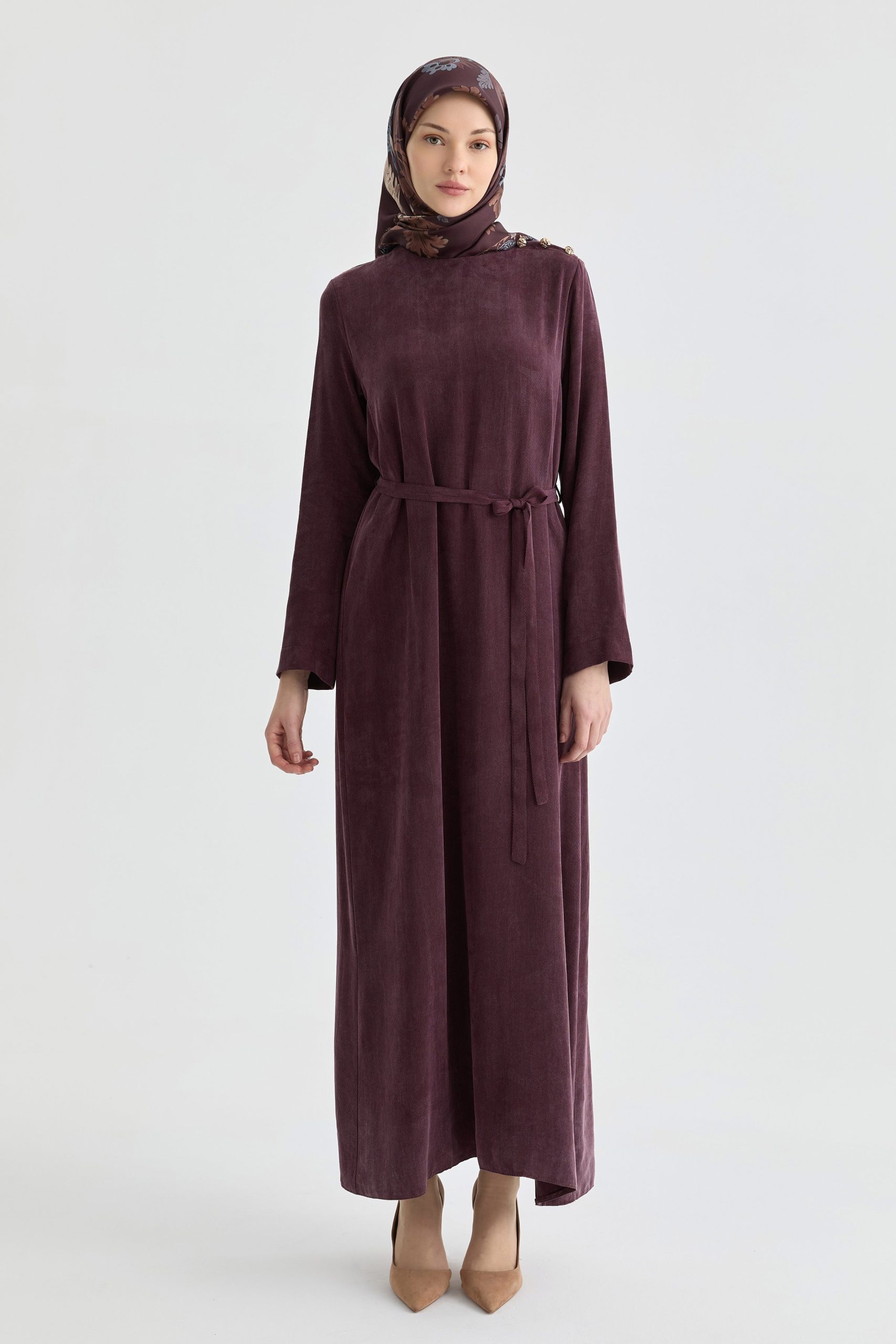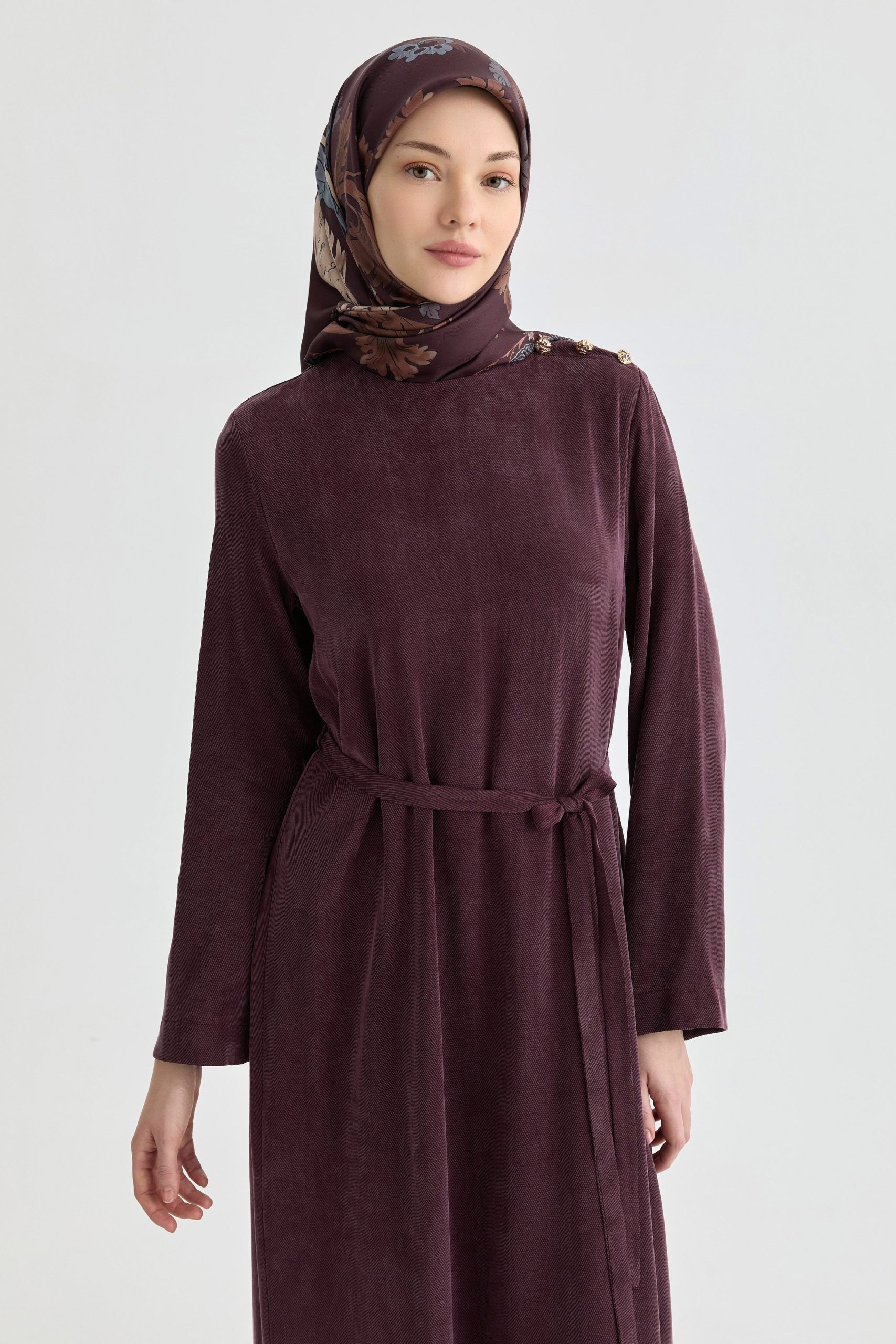 Omuz kısmındaki metal düğme detayı, elbiseye sofistike bir duruş kazandırırken sade siluetiyle gün boyu konfor ve zarafet bir arada.