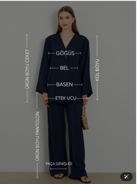 Kimono yaka formuna sahip, bel kısmından bağlamalı, büzgü detaylı, rahat kesim, pantolon beli lastikli, içten beli bağlamalı ayarlanabilir, bol paça, rahat kalıp, önden bağlama detaylı kimono pantolon takım.