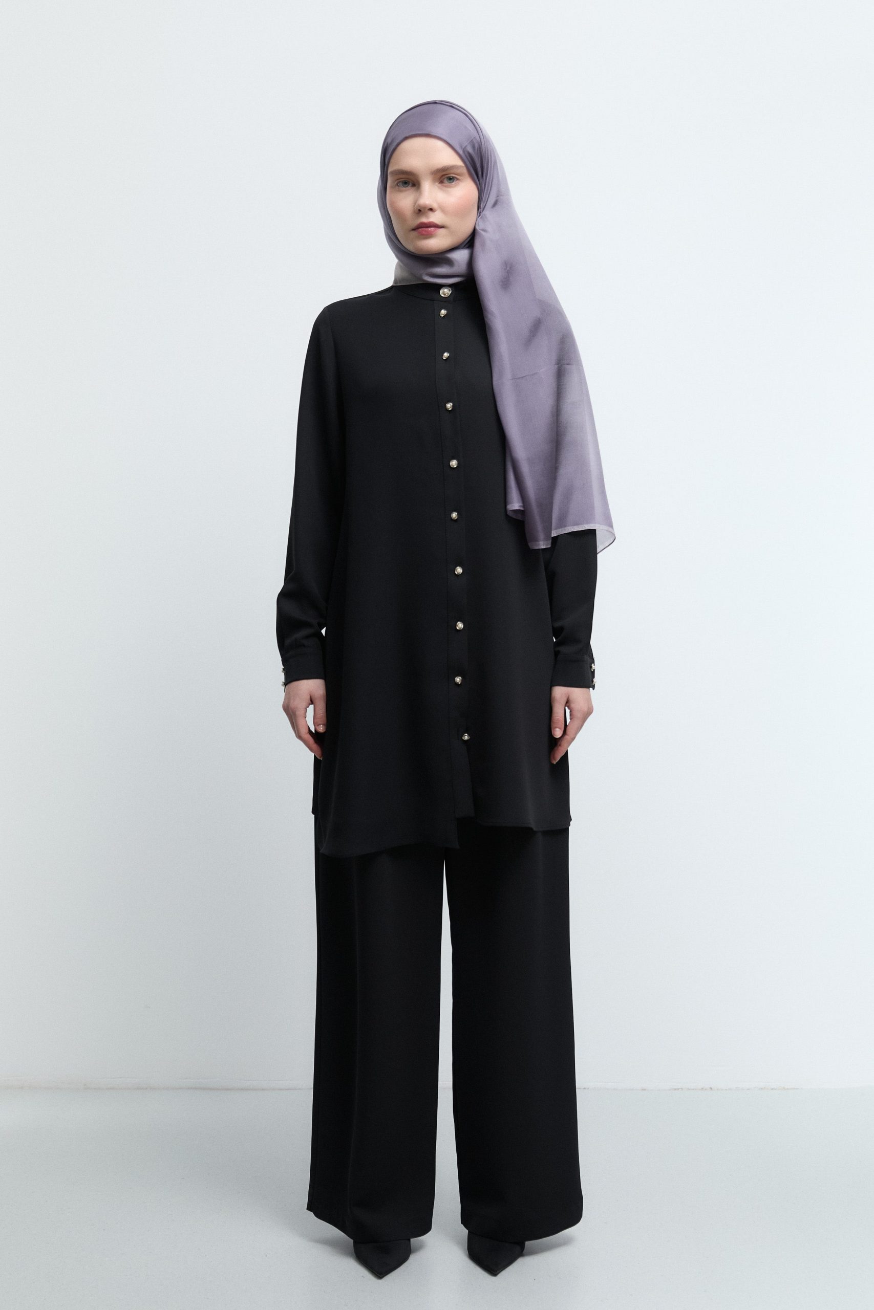 Ön bölümde yer alan tül detayıyla zarif bir kontrast sunan bu tunik, feminen dokunuşu modern çizgilerle buluşturur.