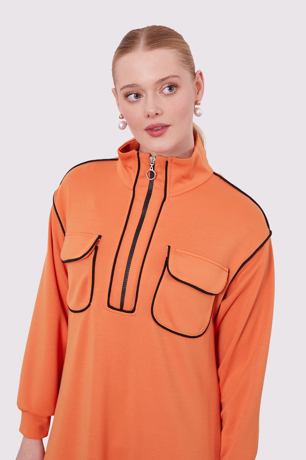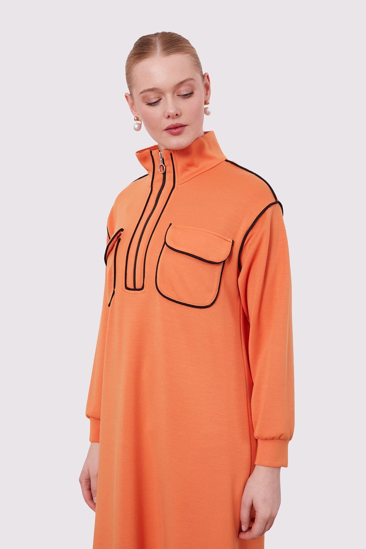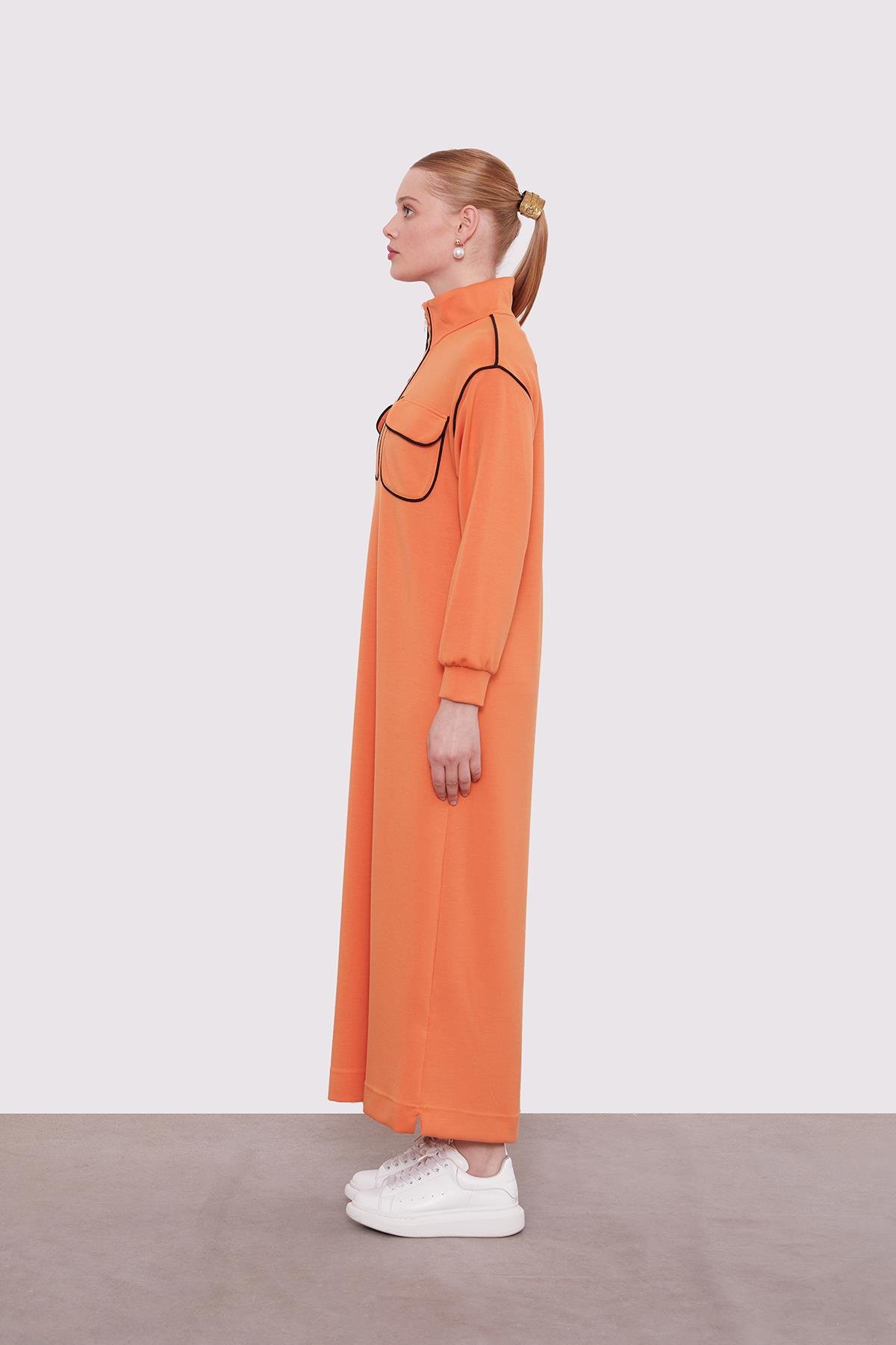 Oranj Çizgi Cep Detaylı Elbise