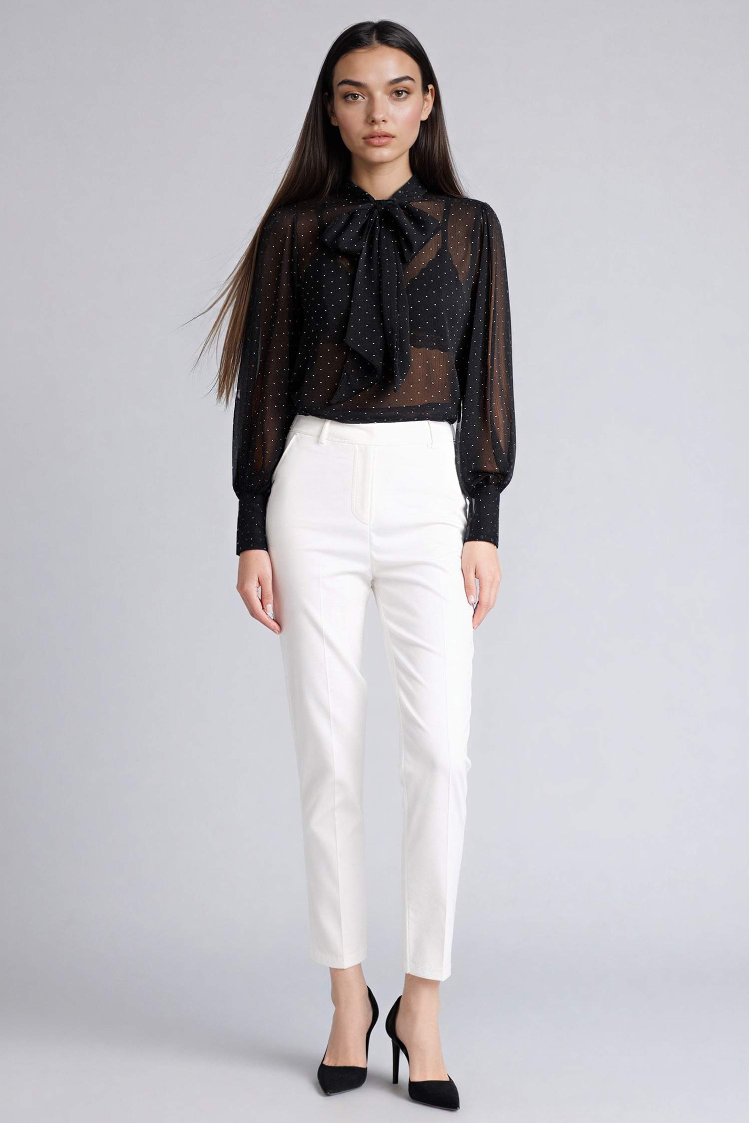 Overshirt fit fular yaka simli twill bluz, modern kesimi ve ışıltılı dokusuyla şıklığı ön plana çıkarır. Twill kumaşın akıcı yapısı gün boyu konfor sunarken, fular yaka detayı tasarıma zarif bir hava katar. Hem ofis hem de özel kombinlerde rahatlıkla tercih edilebilir.