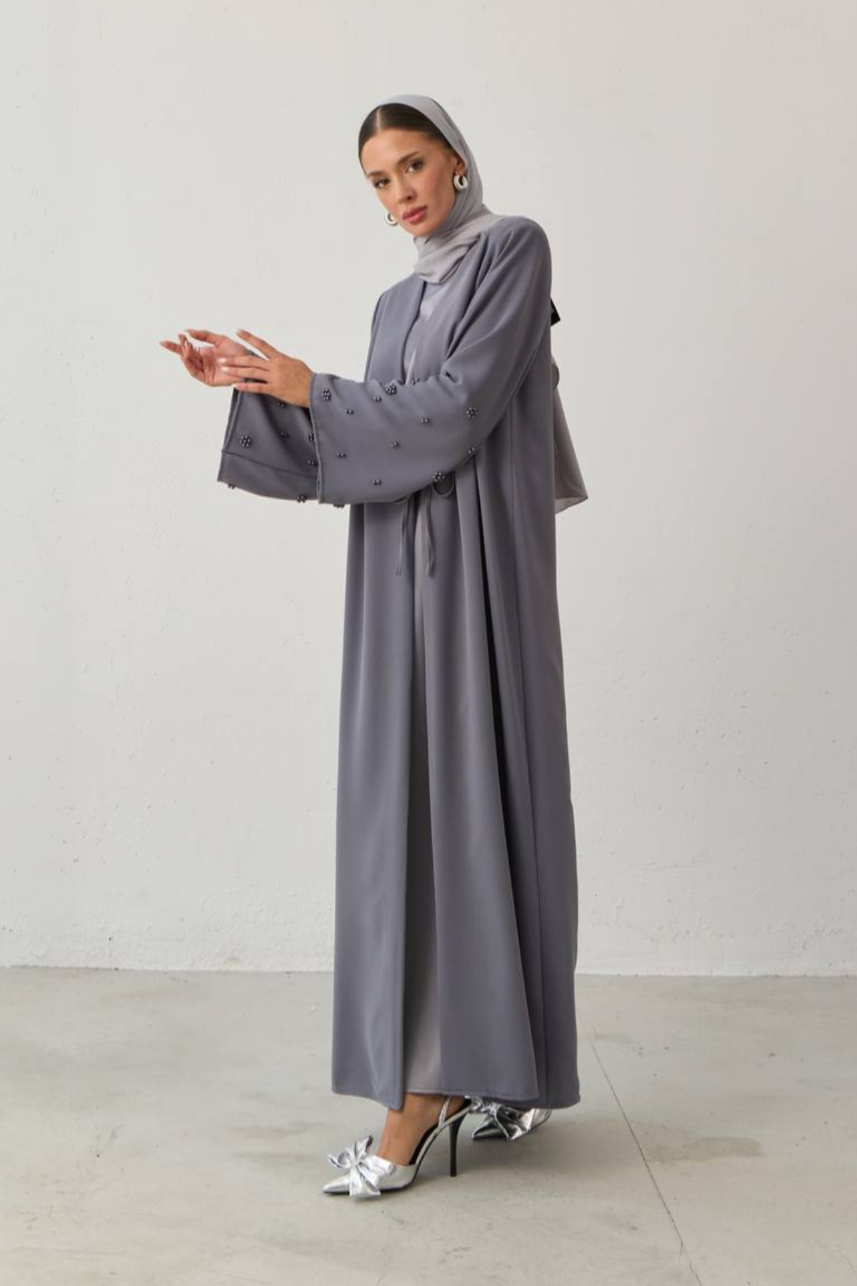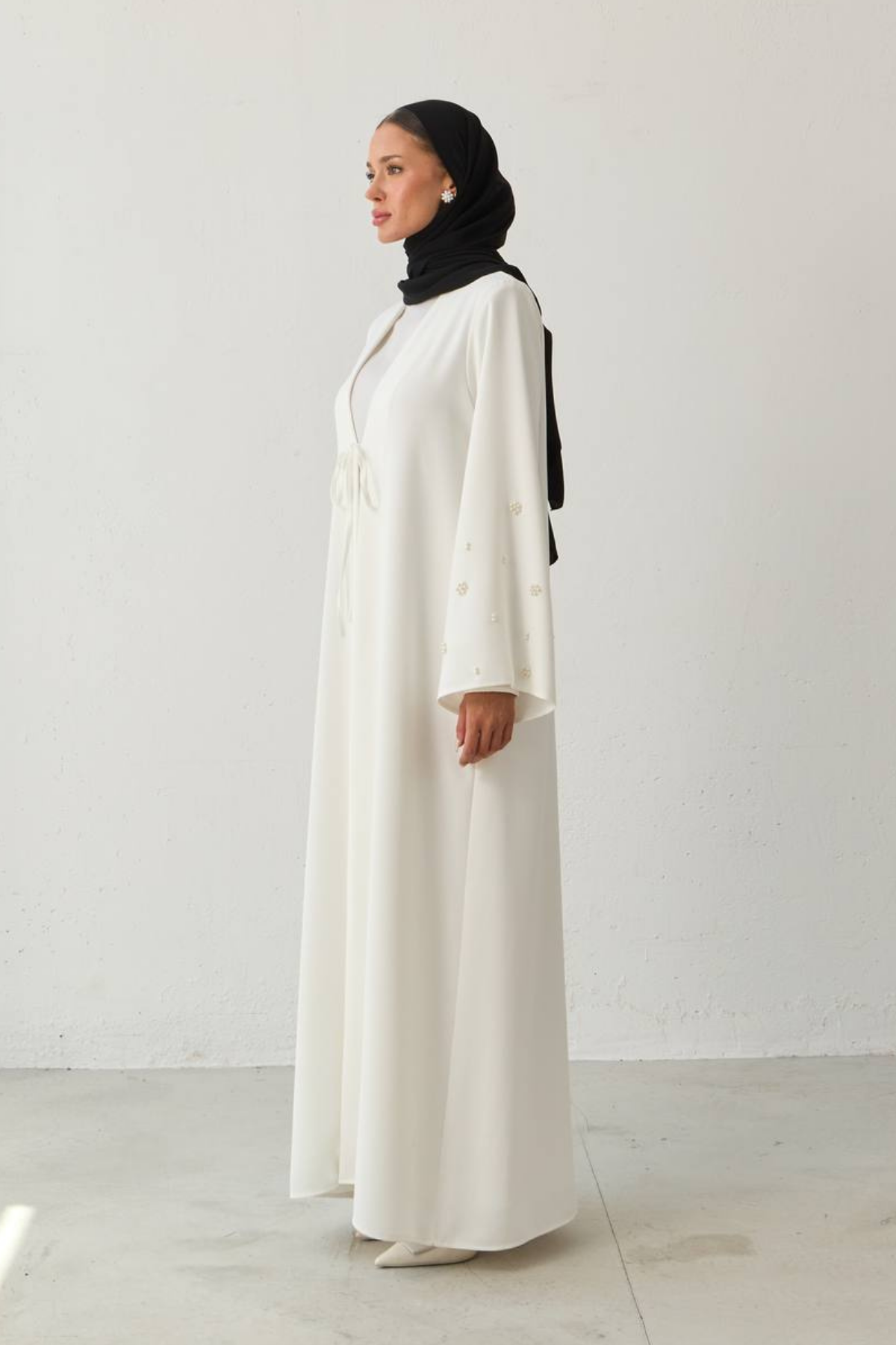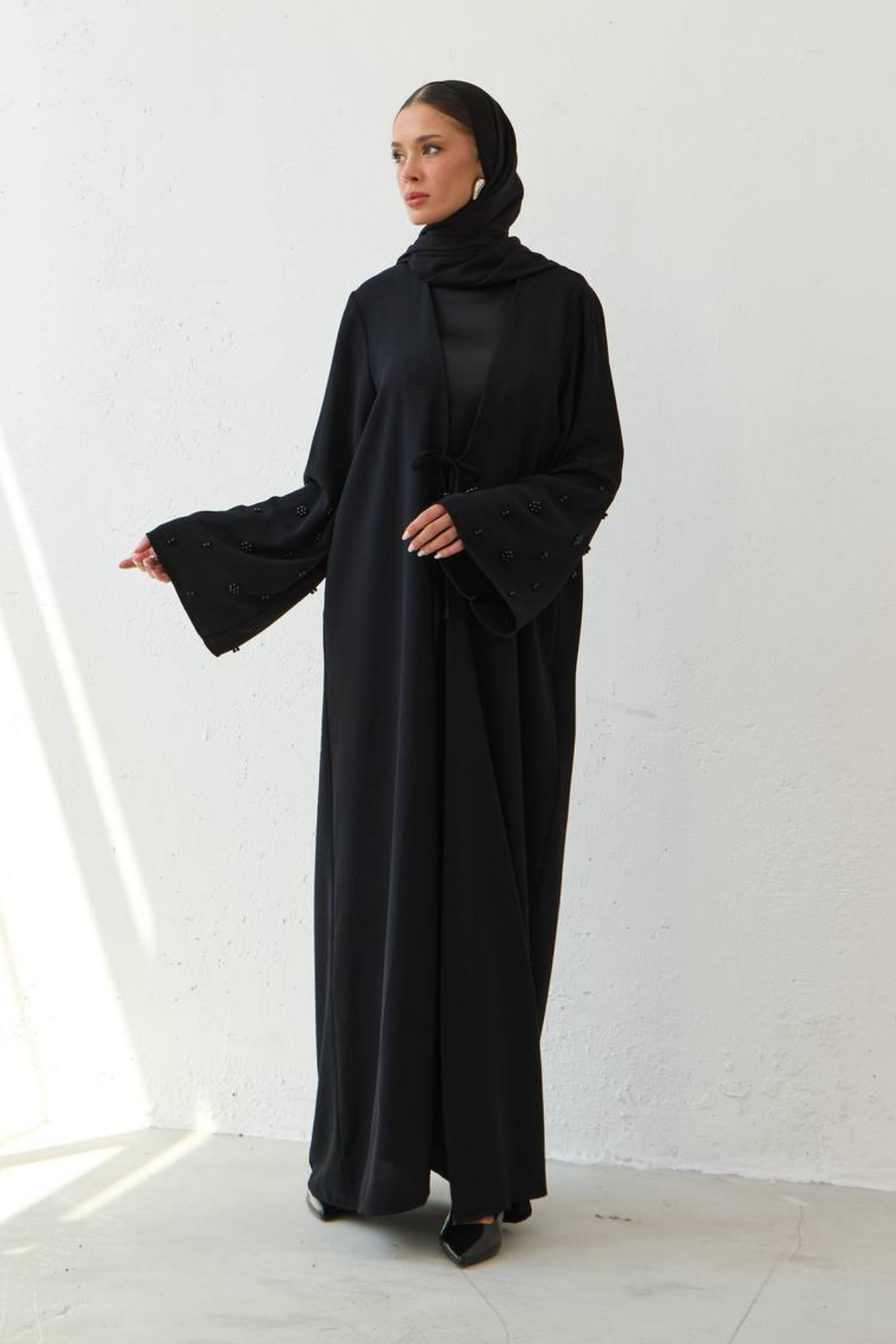Her bir çiçekte zarafet.Zamansız bir şıklığın akışı… Bu özel ferace, kollarında yer alan inci görünümlü çiçek nakışlarıyla süslenmiştir. Premium krep kumaşı vücutta akıcı bir şekilde durur; gün boyu konfor ve zarafeti bir araya getirir. Minimal kesimi ve dikkat çeken kol detaylarıyla Pearl Bloom, modern tesettür modasının sade ama etkileyici bir ifadesidir.