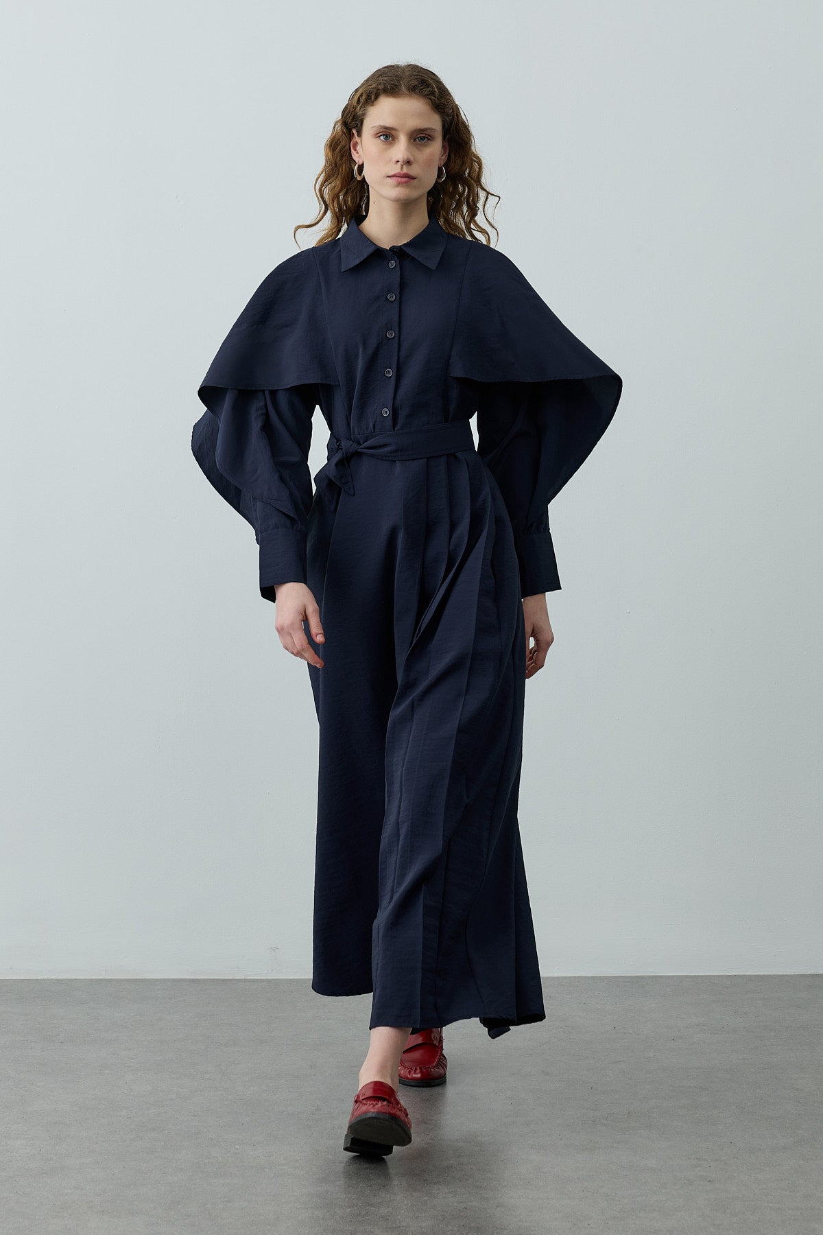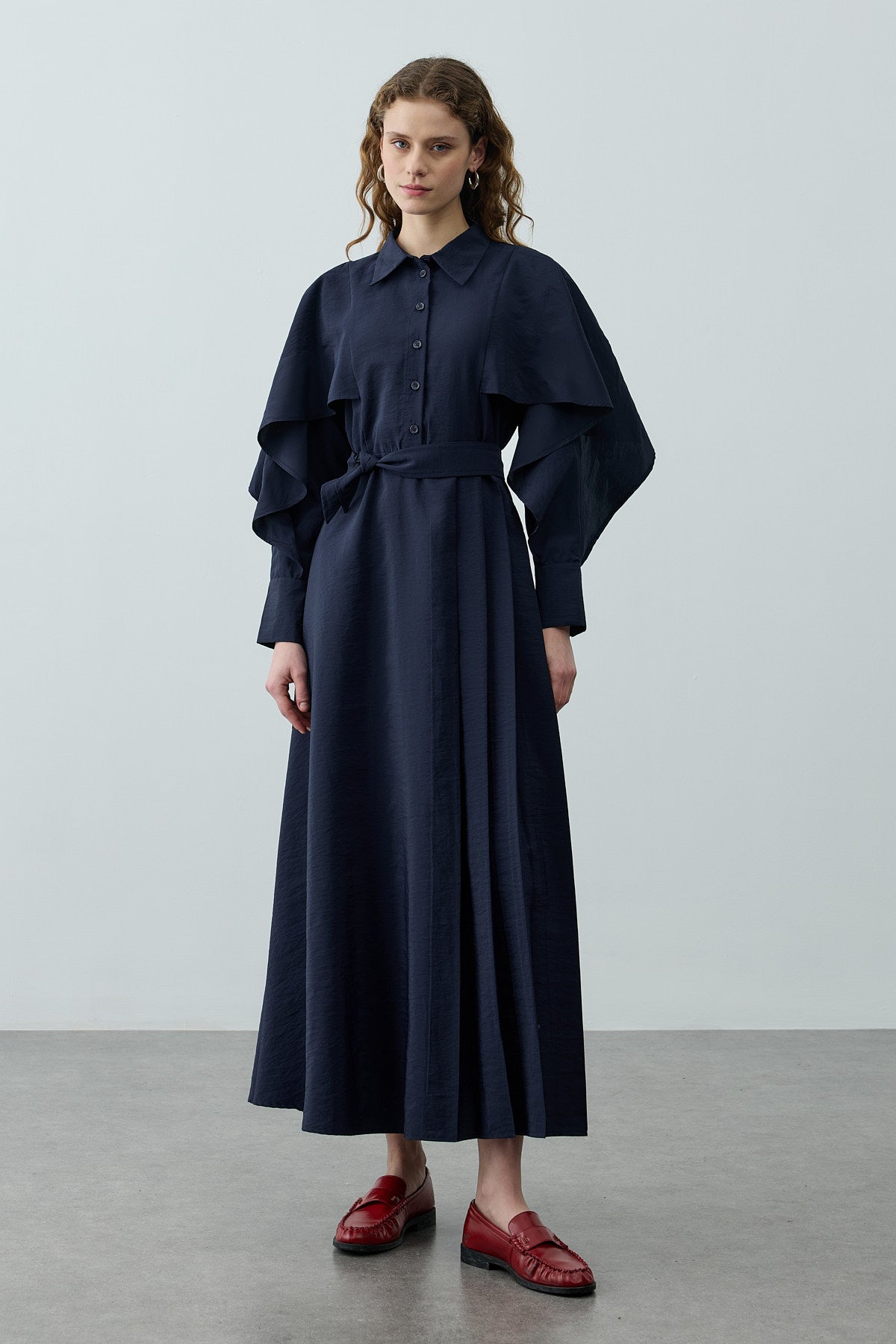 Dokuma kumaştan, gömlek yakalı, önü yarım patlı, düğme kapamalı, uzun kollu, manşetli, seyyar kemerli, kolları ve omzu pelerin detaylı, maxi boy elbise.