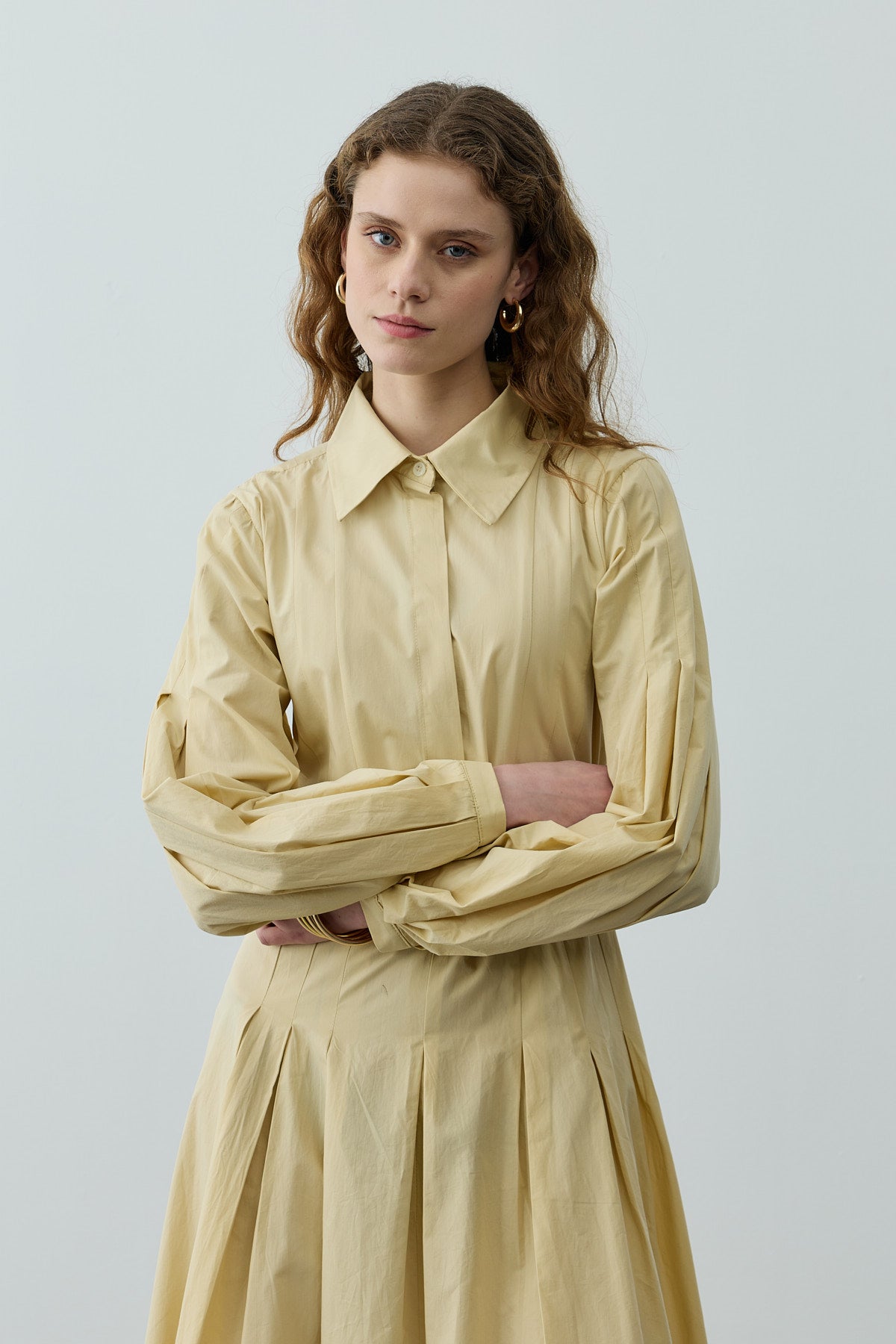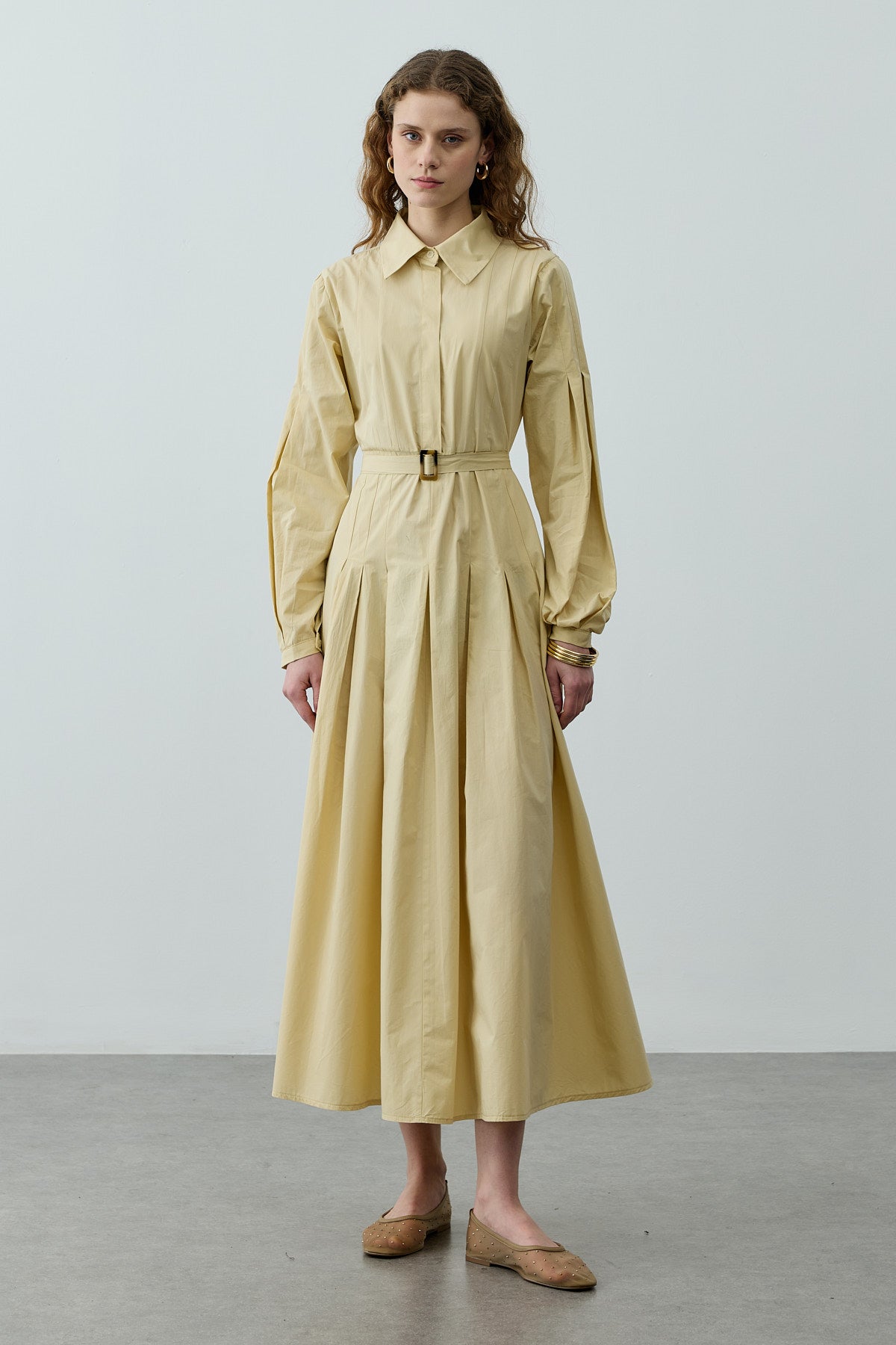 % 100 Pamuk dokuma kumaştan, uzun kollu, kolları pensli pileli, gömlek yakalı, ince kemer detaylı, beli pensli, maxi boy elbise.