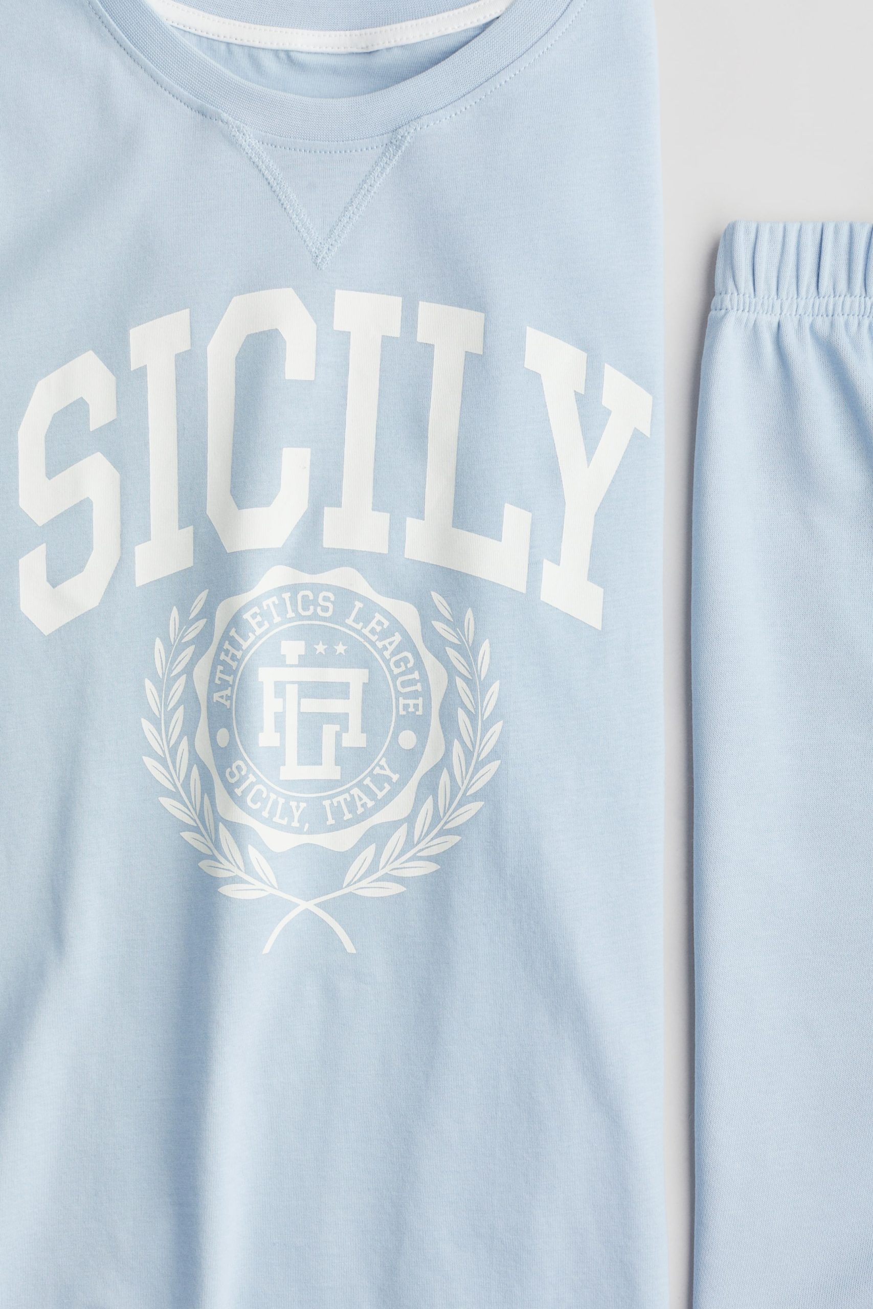 Tişört ve uyumlu şort içeren pijama takımı. Pamuklu ve baskılı yumuşak jarseden, ribana şeritli yuvarlak yakalı, düşük omuzlu tişört. Hafif sweatshirt kumaştan, beli kaplı lastikli şort.