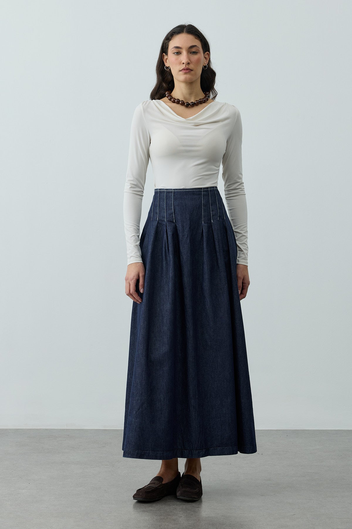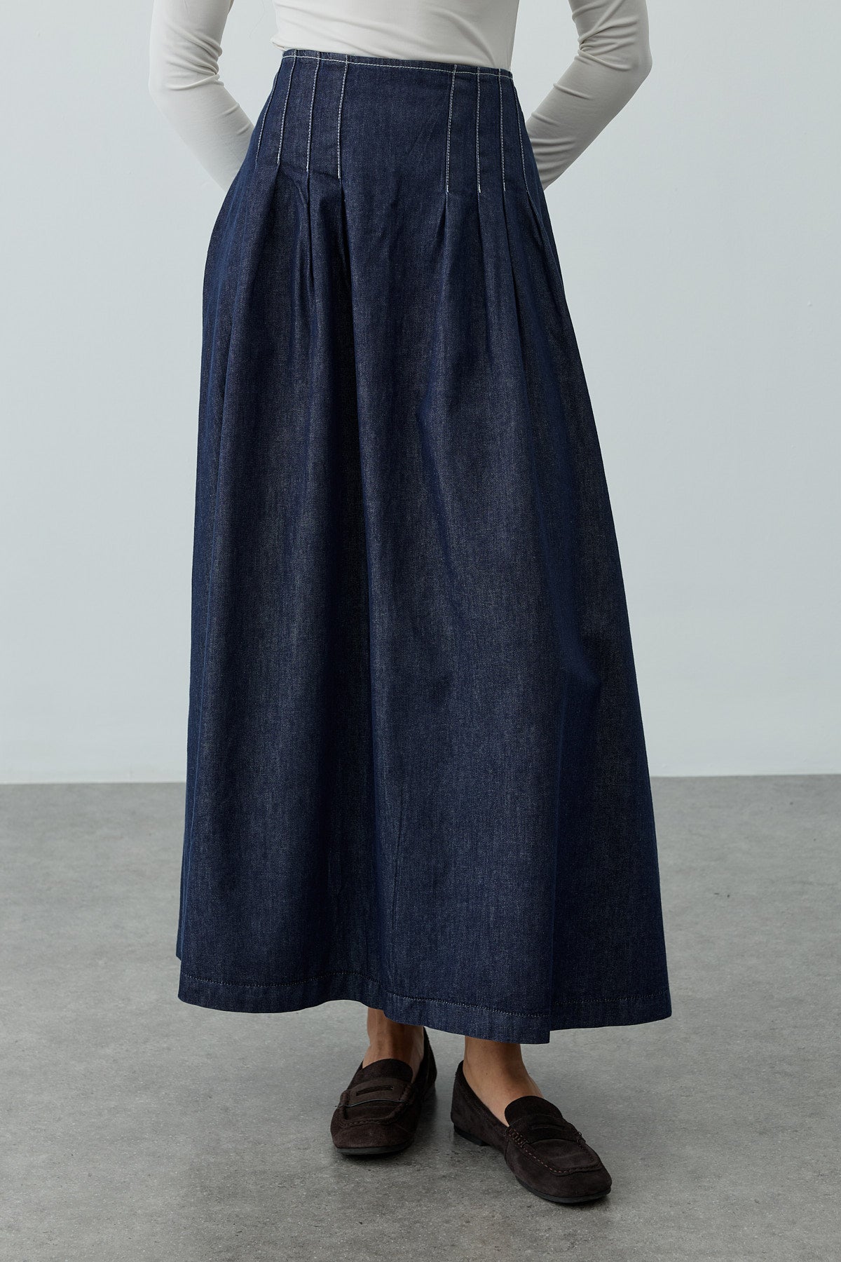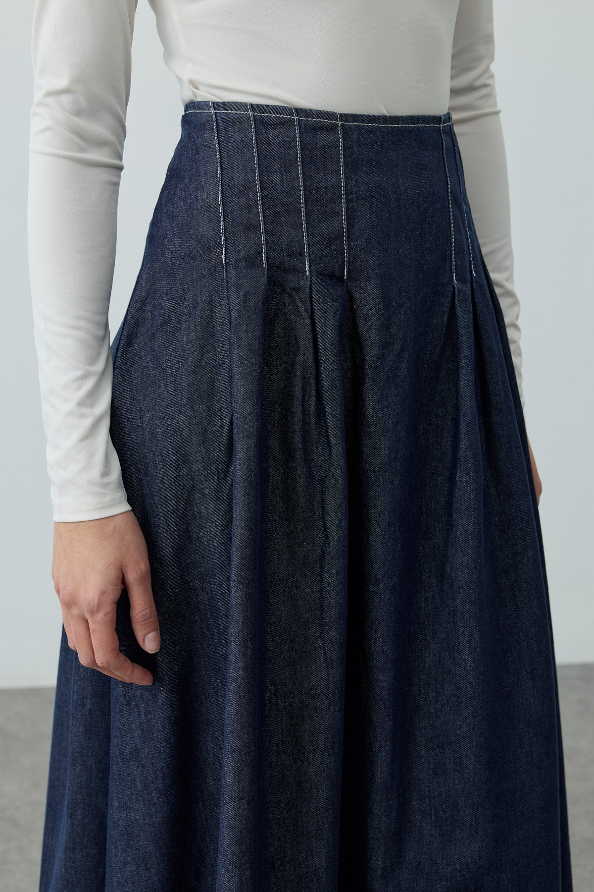 Denim dokuma kumaştan, yüksek belli, belirgin dikiş ve pilili detaylar, gizli fermuar kapamalı, maxi boy etek.