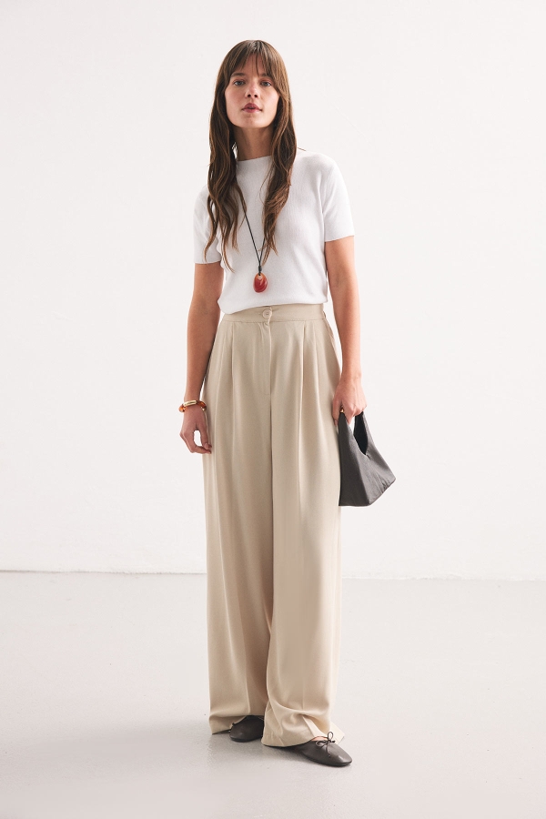 Yüksek bel, önden pile detaylı, arkası lastikli, yandan cepli, dökümlü kumaşa sahip, ütü izli, normal kalıp pileli palazzo pantolon.