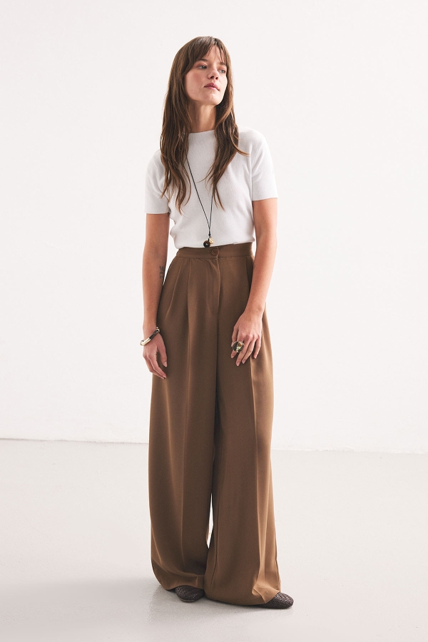 Kahve Rengi Elastik Bel Geniş Paça Pantolon