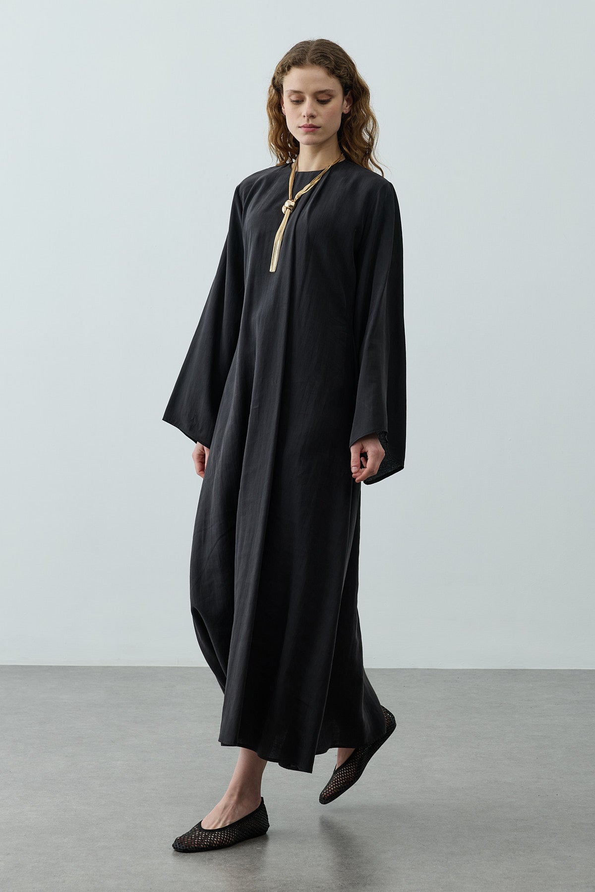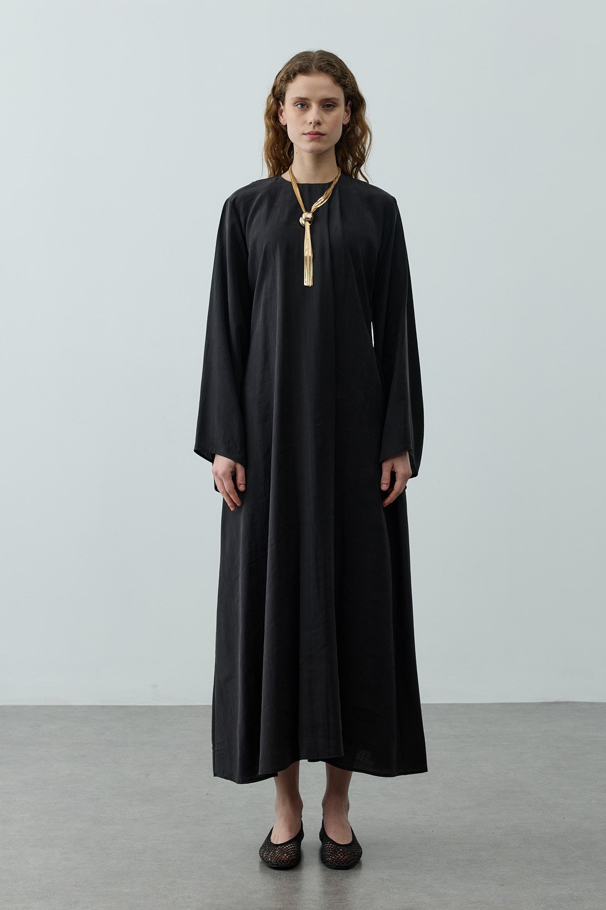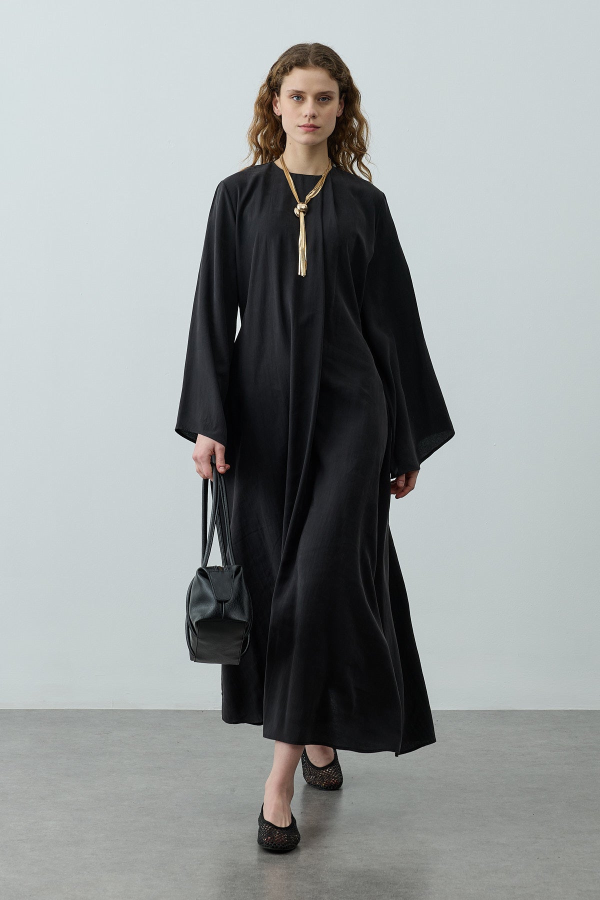 Tensel dokuma kumaştan üretilmiş, bisiklet yakalı, pili detaylı yaka tasarımına sahip, sırt fermuar kapamalı, uzun ve geniş kollu, maxi boy elbise.