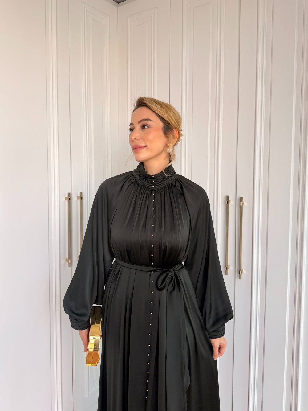 Bej Kuşak Detaylı Saten Kraş Elbise