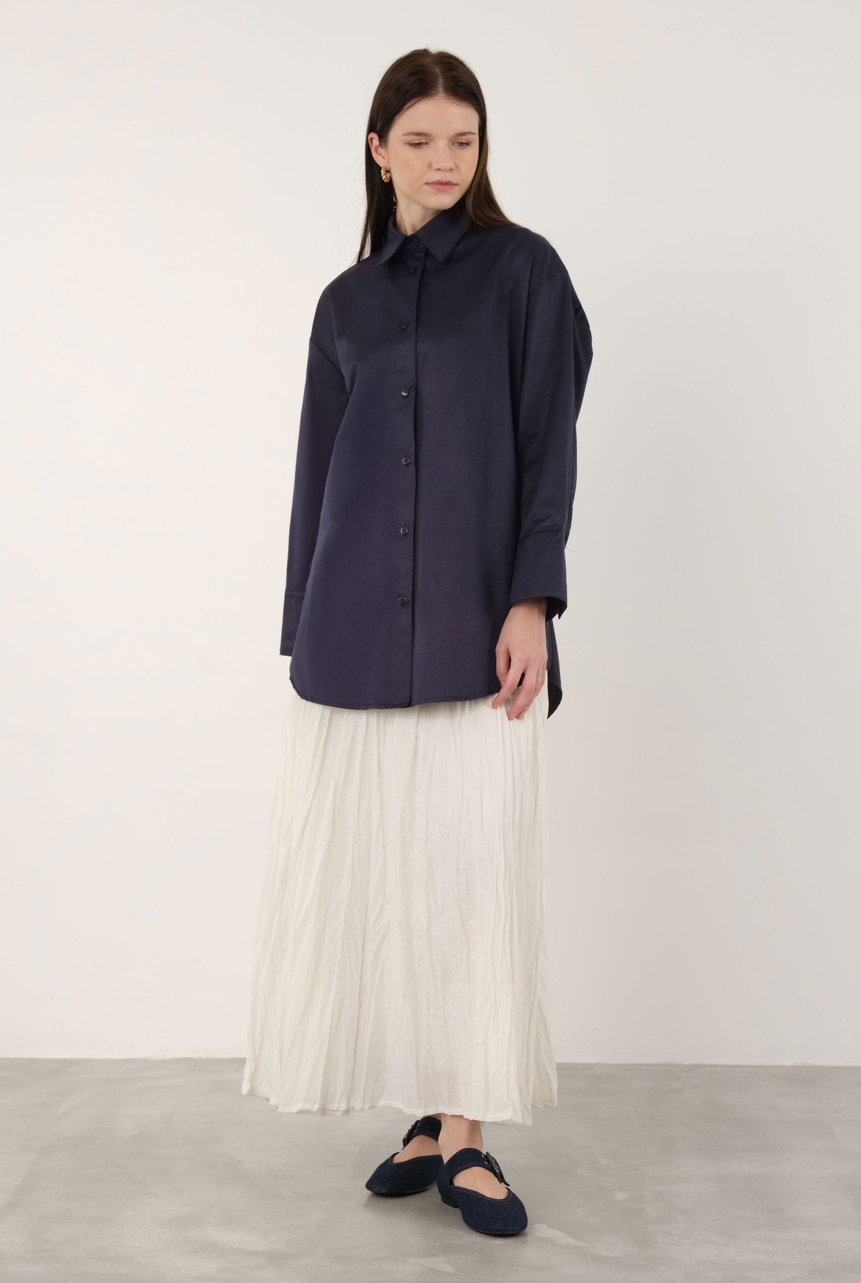 Birit kapama düğmeli, rahat kalıp, yumuşak dokulu özel tasarım süet gömlek.