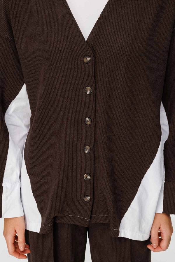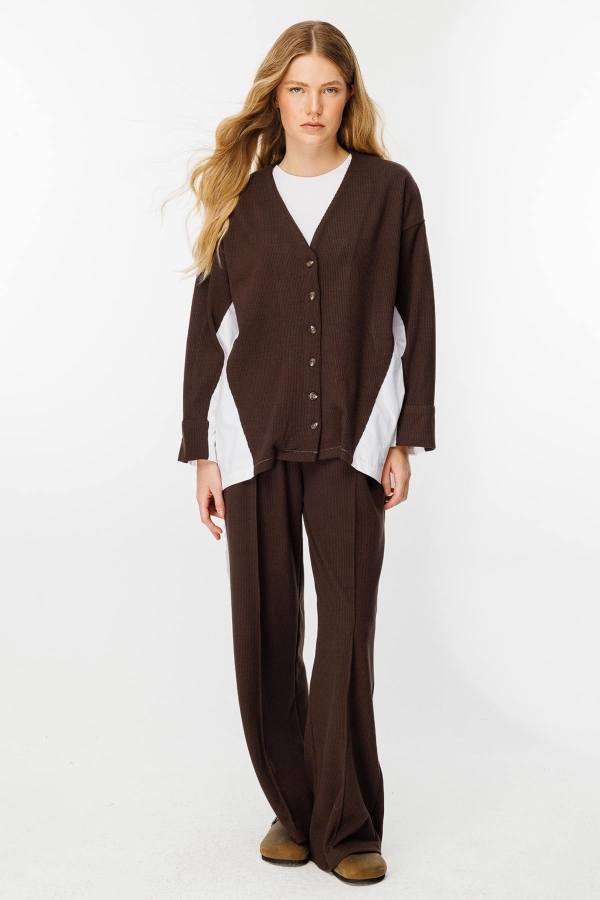 Poplin Triko Hırka Detaylı Kahve Pantolon Takım