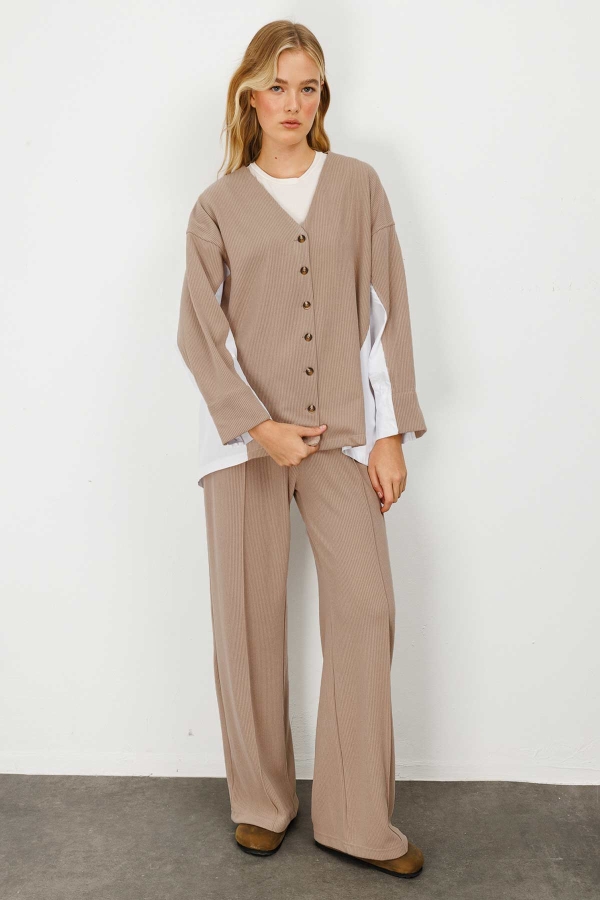 Poplin Triko Hırka Detaylı Vizon Pantolon Takım