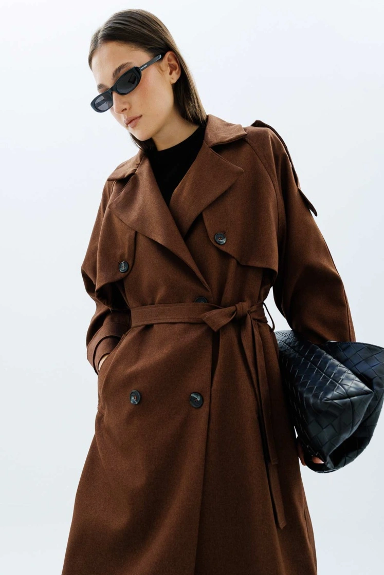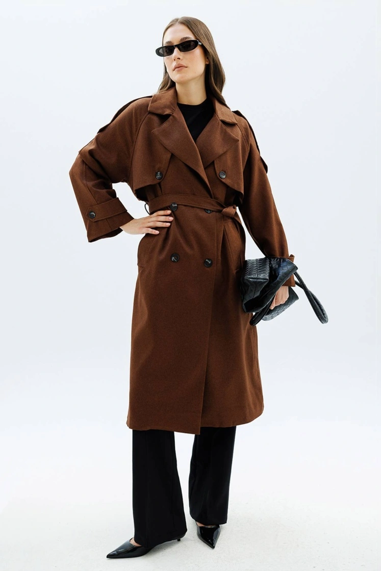 Kruvaze kapama, reglan kol, rüzgarlık ve apolet detaylı, geniş kalıp, yanlardan cepli, kendi kumaşından kemerli, arkadan yırtmaçlı, astarlı, maxi boy yün dokuma efektli trençkot.