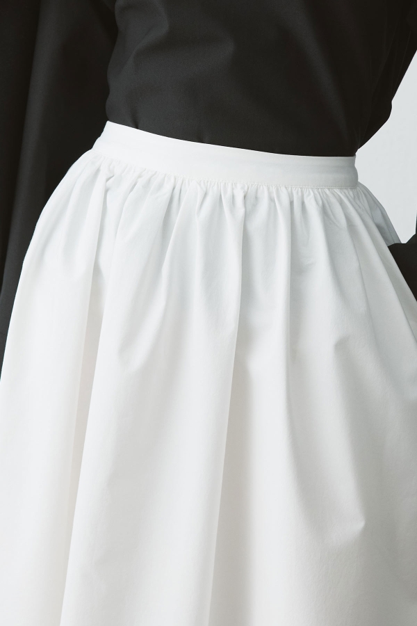 Orta bel, büzgülü, arkadan gizli fermuarlı, yanlardan cepli, premium telalanmış hacimli duran kumaştan iç belli etmeyen astarsız balon etek.