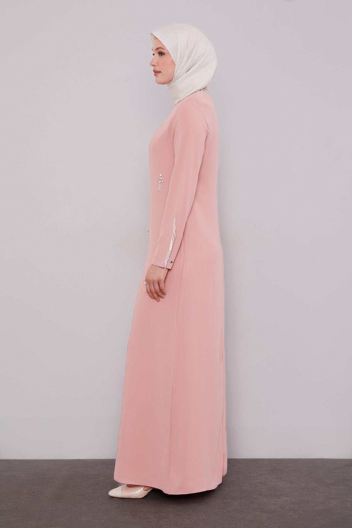 Işıltılı saten dokusuyla asil bir duruş sergileyen bu abiye, zarif kesimi ve inci detaylı kemeriyle şıklığı en sade haliyle yansıtıyor. Davetlerde ve özel günlerde sofistike bir görünüm arayanlar için ideal bir seçim.