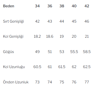Not: Verilen ölçüler en küçük bedene aittir, bedenler arasında ortalama 4 cm fark bulunmaktadır.