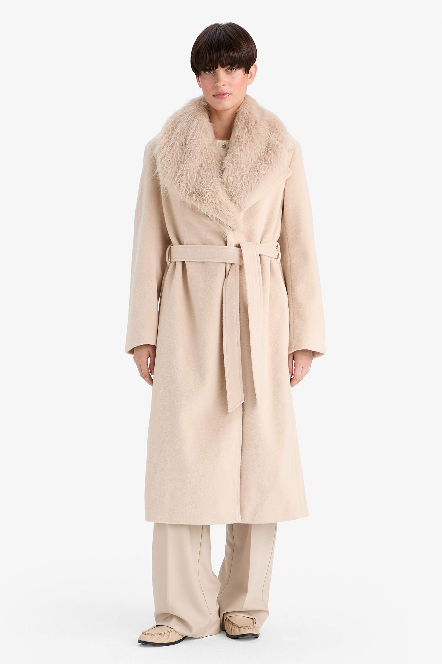 Regular Fit Suni Kürk Yaka Kuşaklı Kaşe Uzun Kaban