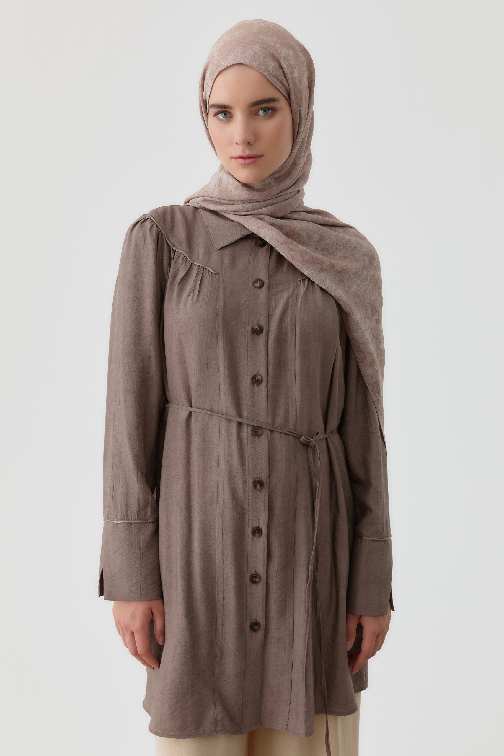 Roba ve büzgü detaylarıyla öne çıkan bu tunik, her adımda hafif bir hareket ve zarif bir dinamizm sunar. Hafif ve akıcı kumaşı, gün boyu konfor sağlarken, modern kesimi günlük ve özel kombinlerinize şıklık katar.