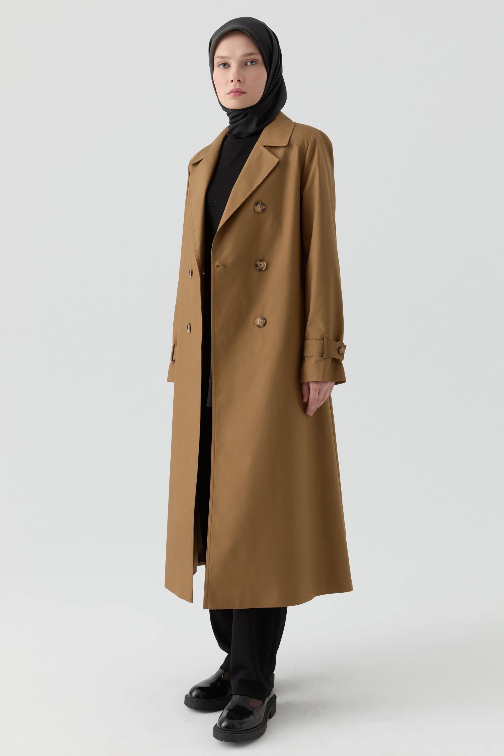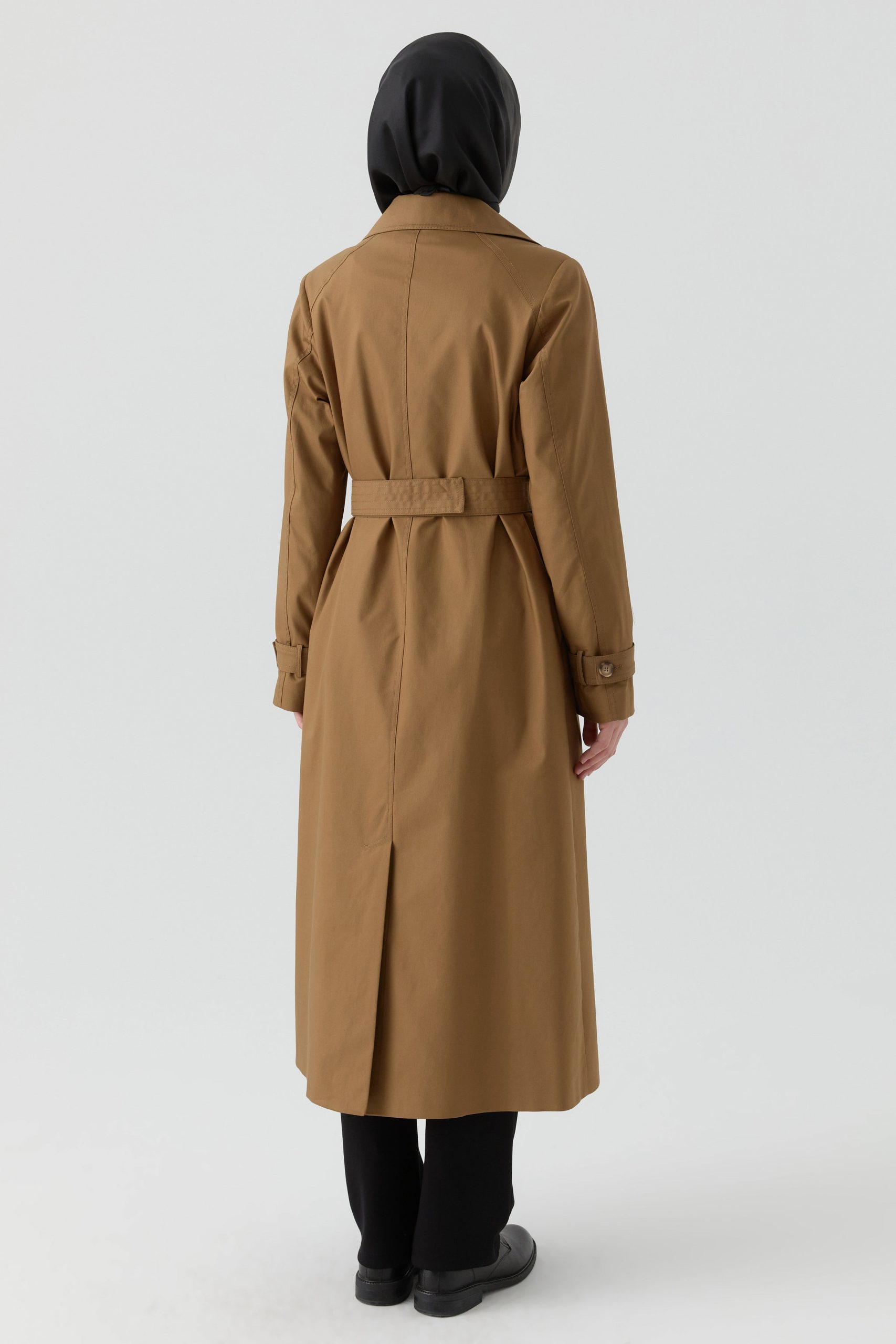 Klasik kruvaze yaka kesimiyle sofistike bir şıklık sunan bu trençkot, ön ve arka kısmında yer alan rüzgarlık detayıyla fonksiyonel olduğu kadar modern bir görünüm de kazandırır.