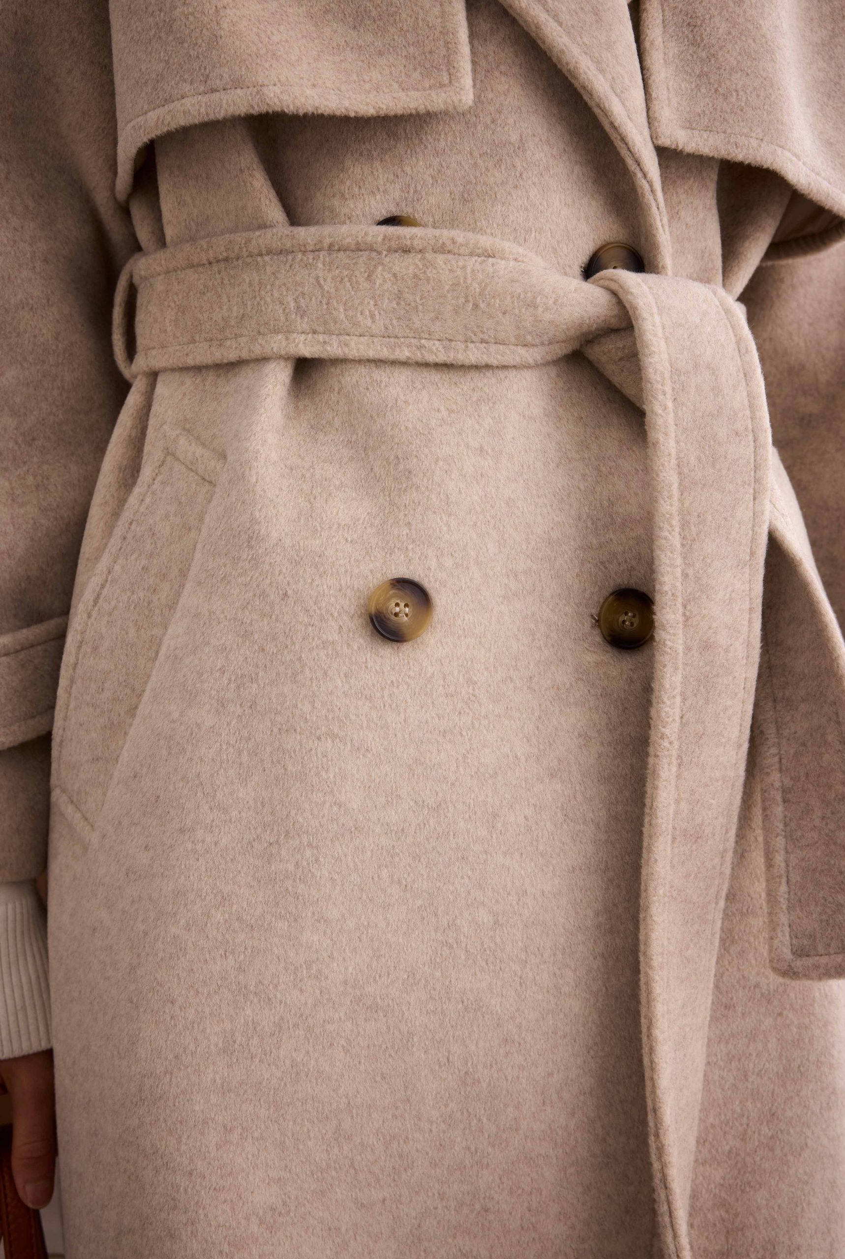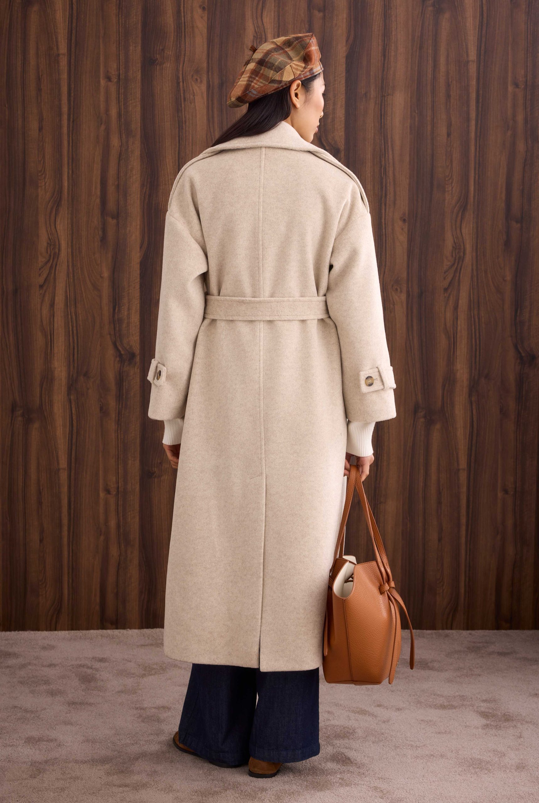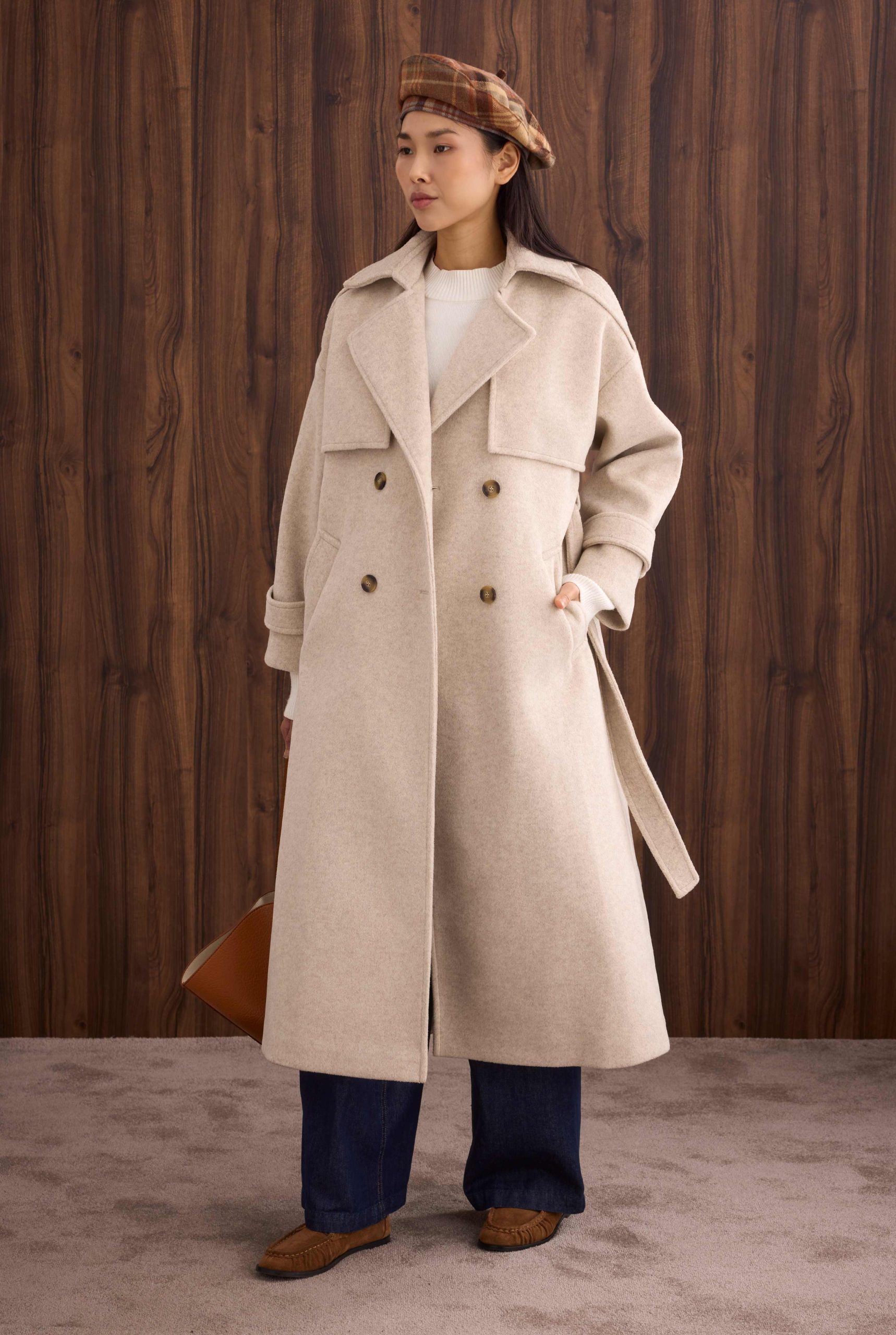 Zarif kalıbı ve kemer detayıyla feminen bir siluet sunan uzun kaban, hem günlük kullanımda hem de şehirli stillerde şık bir duruş kazandırır. Rüzgarlıklı tasarımı modele modern ve dinamik bir görünüm katarken, astarlı yapısı iç kısmın pürüzsüz durmasını ve giyimde konforu destekler.