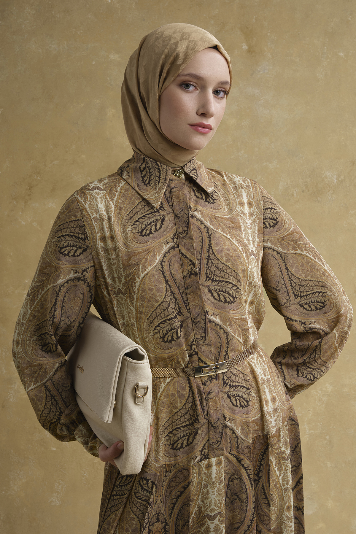 Zamansız şal deseniyle öne çıkan bu elbise, akıcı formu ve uzun siluetiyle zarif bir duruş sunar. Bel kısmındaki kemer detayı vücut oranını dengelerken, hafif ve dökümlü yapısı gün boyu konfor sağlar. Hem günlük şıklıkta hem de özel davet kombinlerinde sofistike bir alternatif olarak öne çıkar.