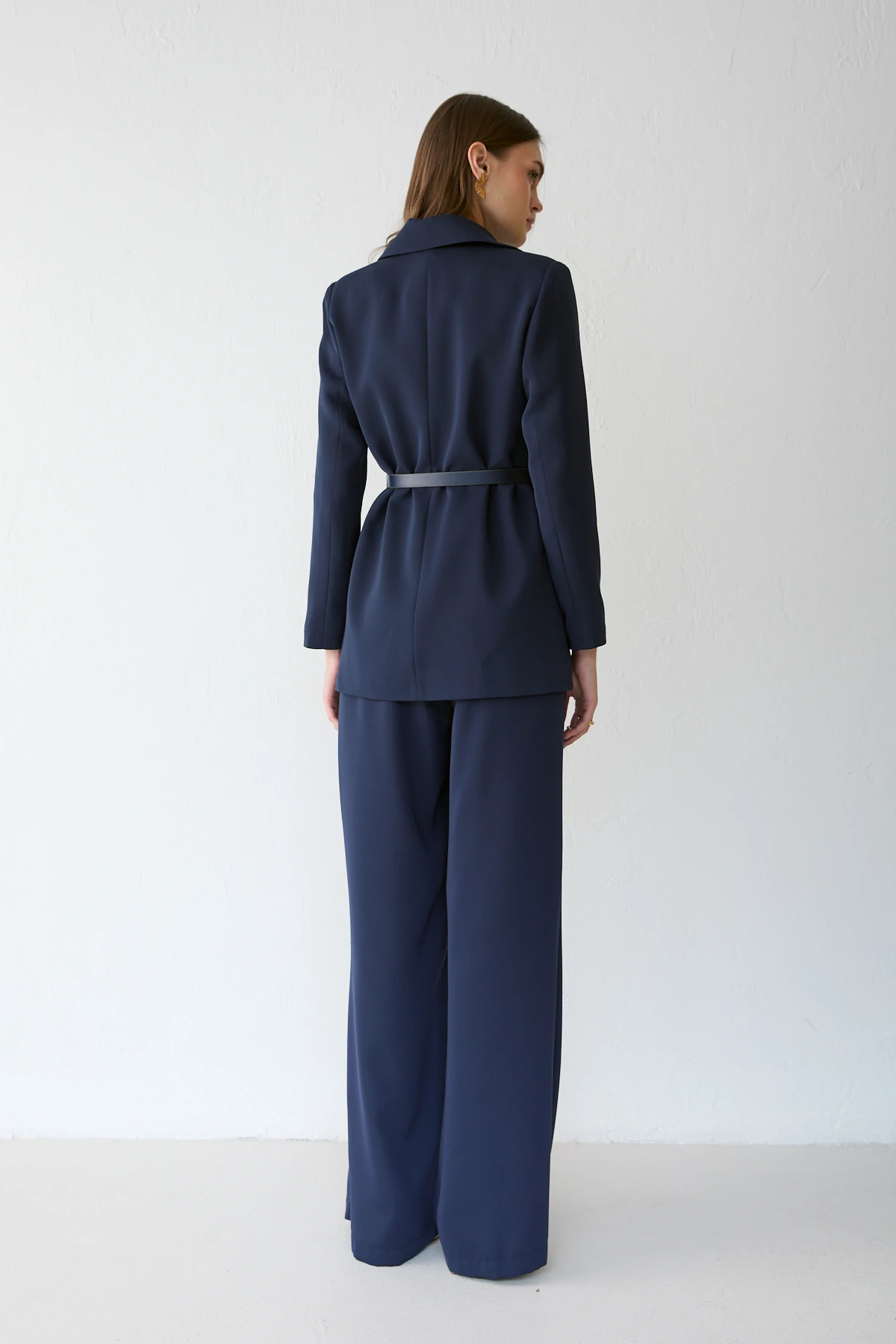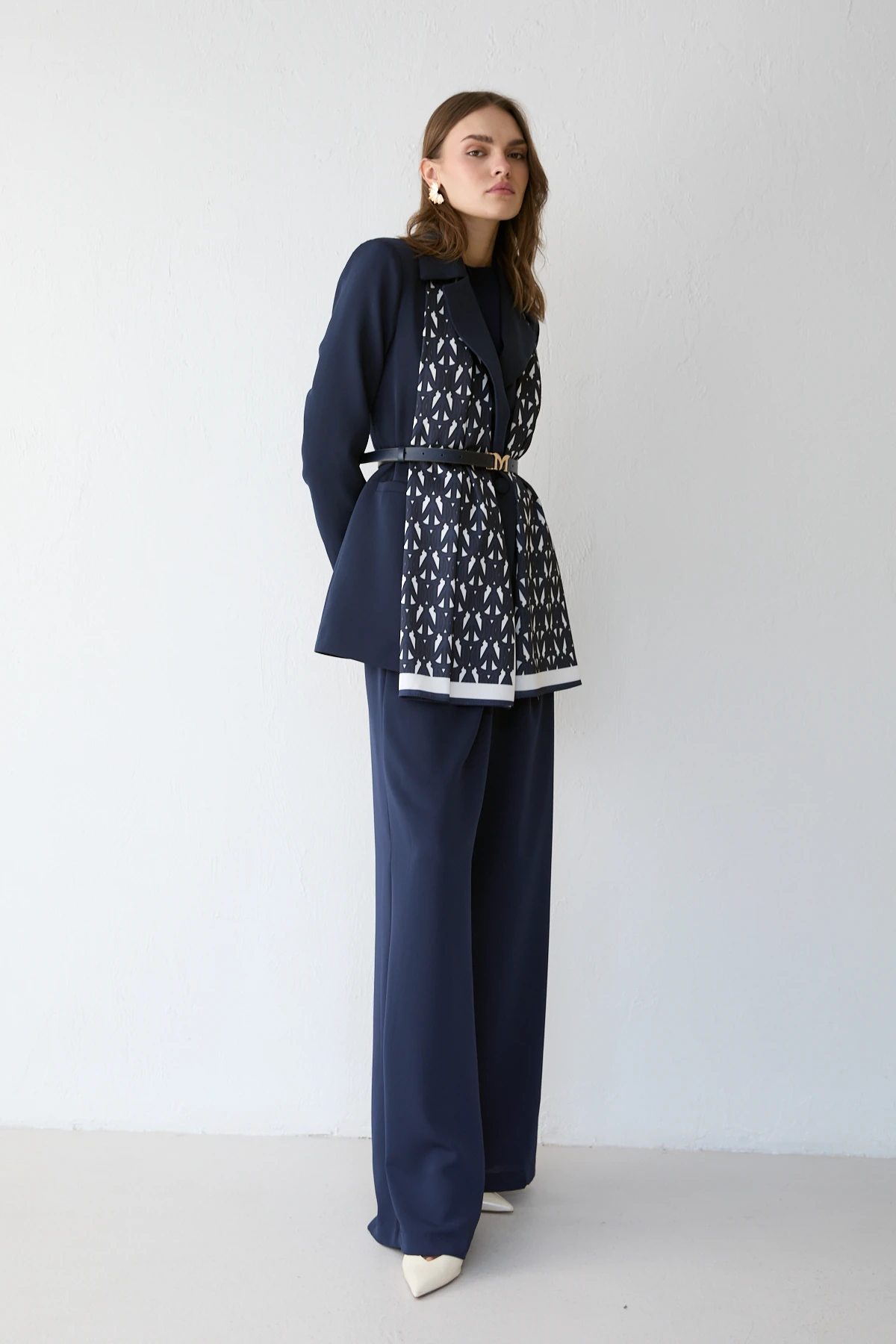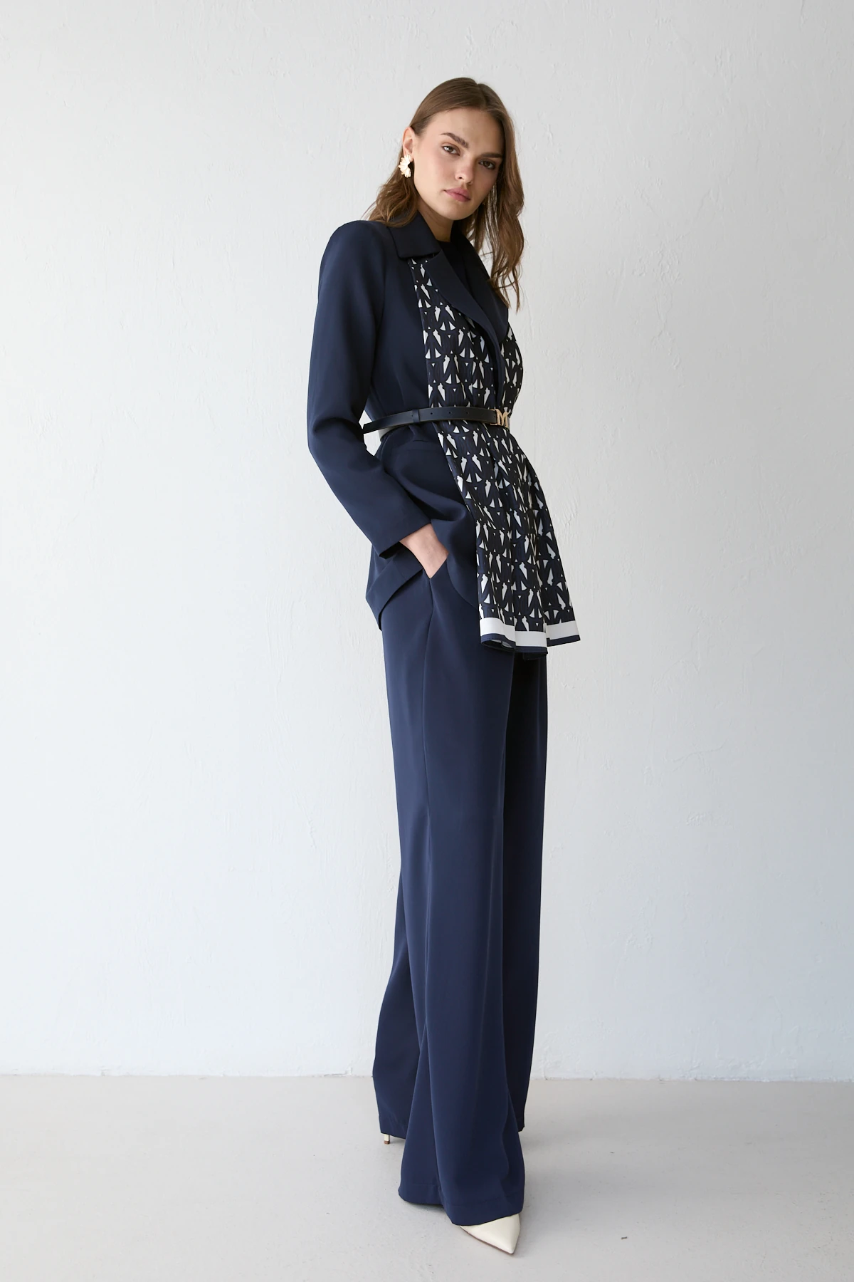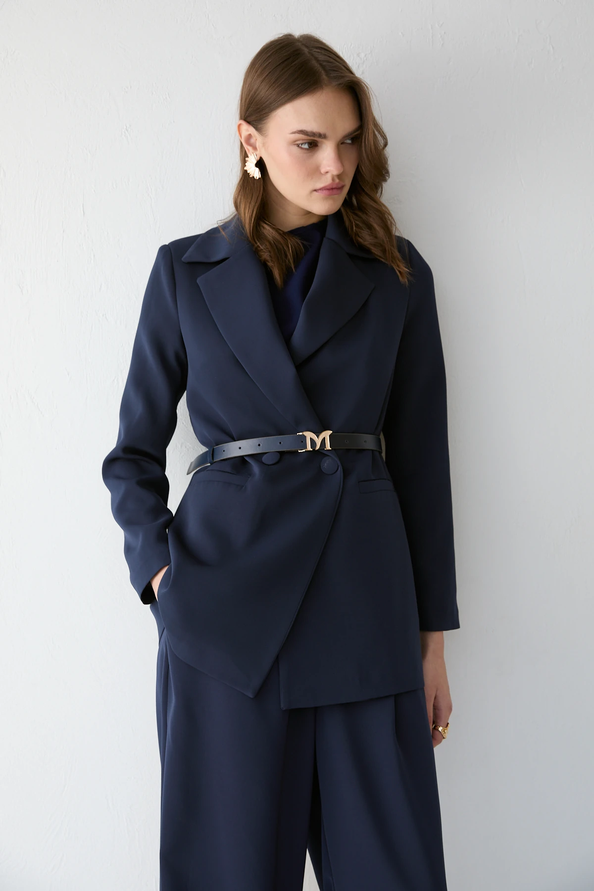Önden düğmeli tasarımı, vatkalı omuz yapısı ve ön cep detayıyla güçlü ve şık bir görünüm sunan takım; seyyar kemer ve şal aksesuarıyla tamamlanır. Astarlı üst formu ile pantolonun önü düz, arkası lastikli bel yapısı gün boyu konfor sağlar. Adriana krep kumaşın zarif duruşu ve saten şal detayı modele özel bir şıklık kazandırır.