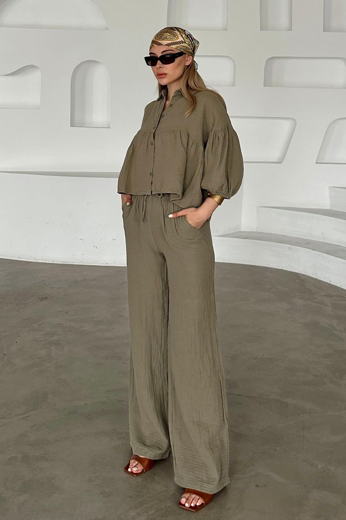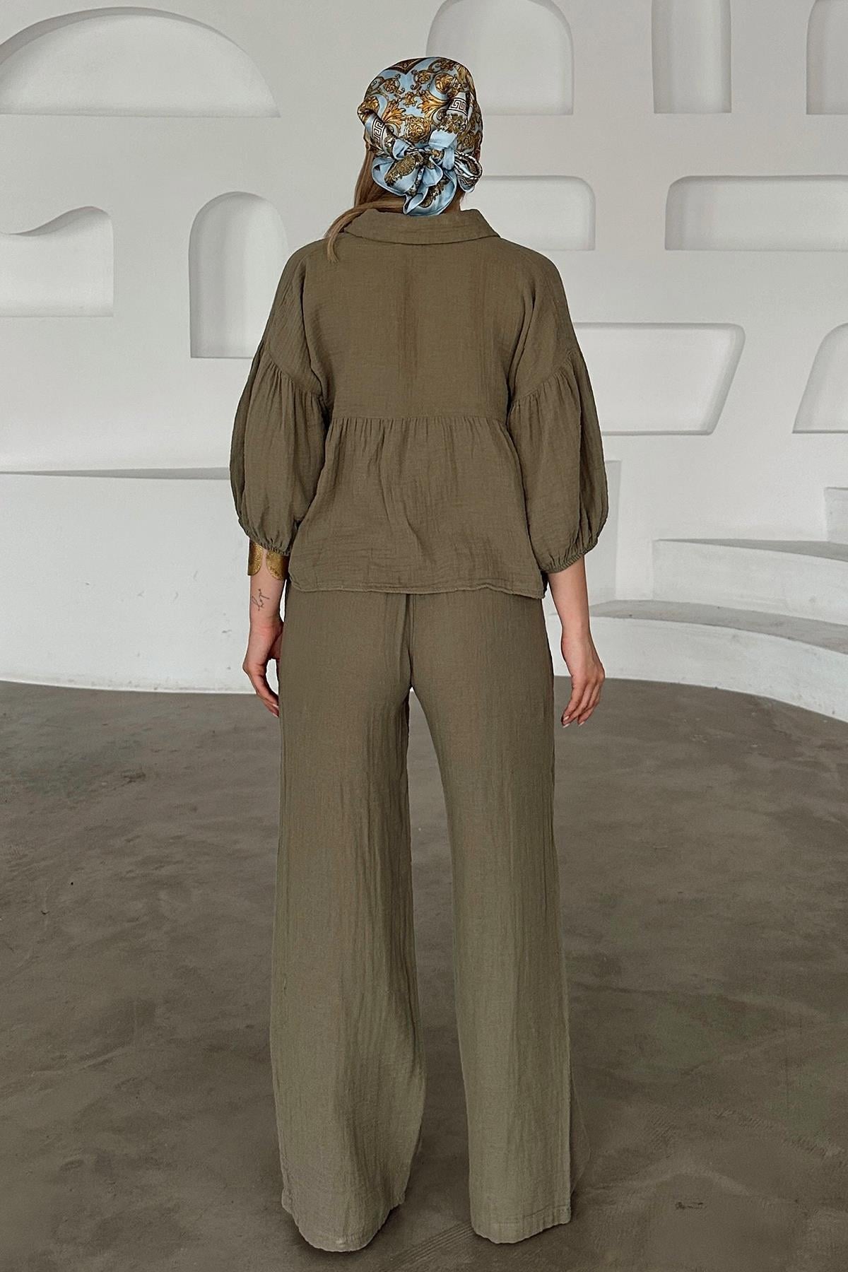 Salaş Kısa Gömlekli İkili Müslin Takım HAKİ 9355-TK