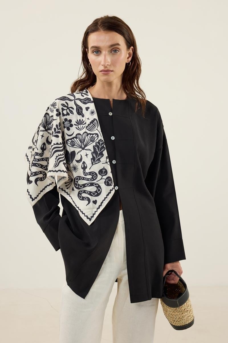 Sedef Düğmeli Modal Tunik Siyah, modern tasarımı ve rahat kalıbıyla yaz sezonunun vazgeçilmez parçalarından biri. %65 viskon, %28 naylon ve %7 liyosel karışımlı kumaşı, yumuşak dokusuyla hafiflik ve nefes alabilirlik sunarken gün boyu konfor sağlar. Bisiklet yaka ve düşük omuz tasarımı, rahat bir siluet oluştururken, brit detayları ve sedef parlaklığındaki düğmeler, tunik formuna zarif bir dokunuş katar.