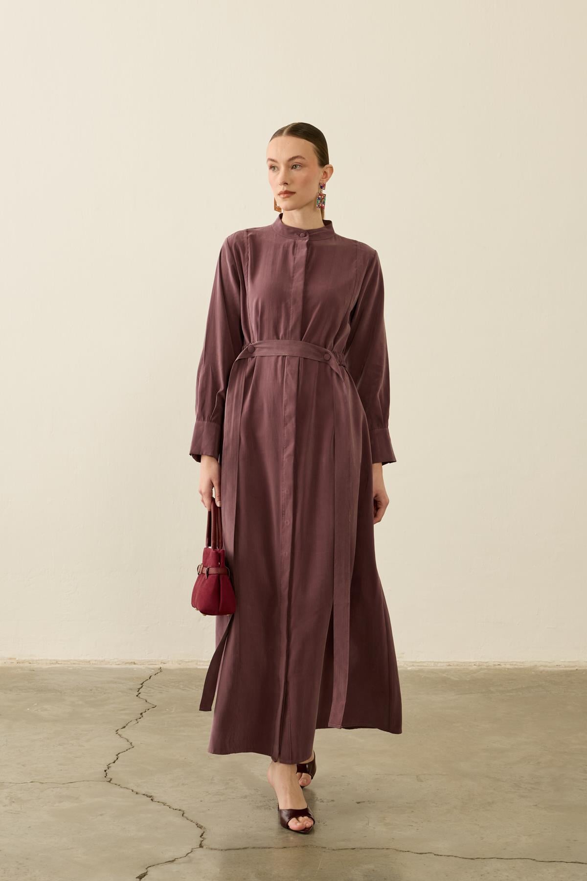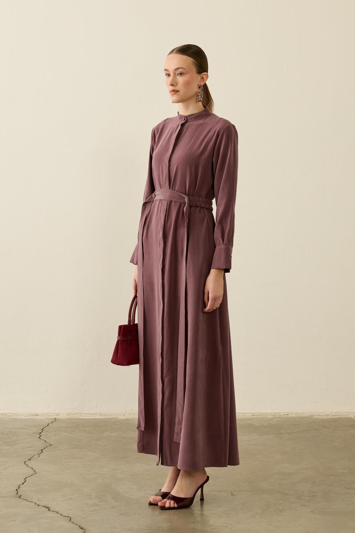 Sevi Hakim Yaka Kemeri Lastikli Modal Elbise MÜRDÜM