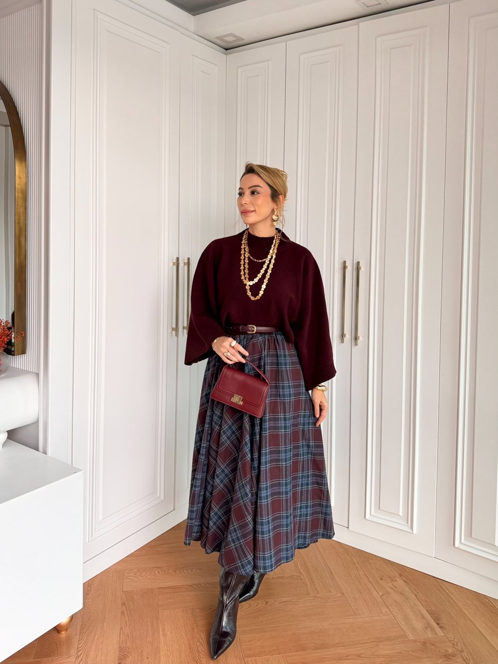 Bu etek ekose desen detaylarına sahiptir. Bel kısmı lastikli olup rahat bir kullanım sunar. Geniş formlu tasarımıyla şık ve konforlu bir görünüm sağlar. Etek boyu: 86 cm, bel ölçüsü: 38 cm.
