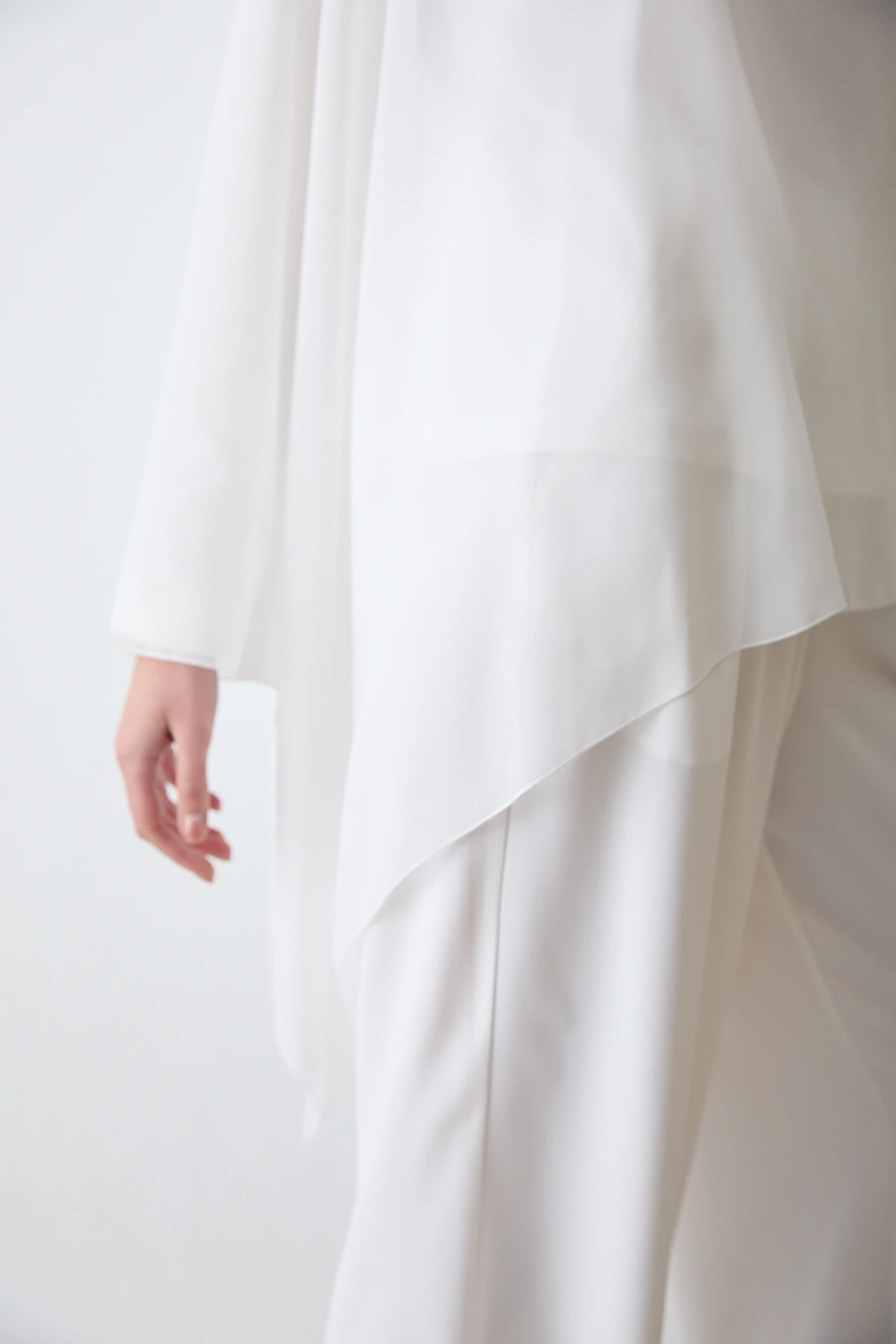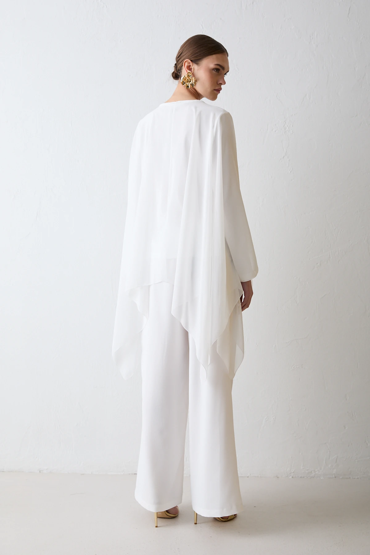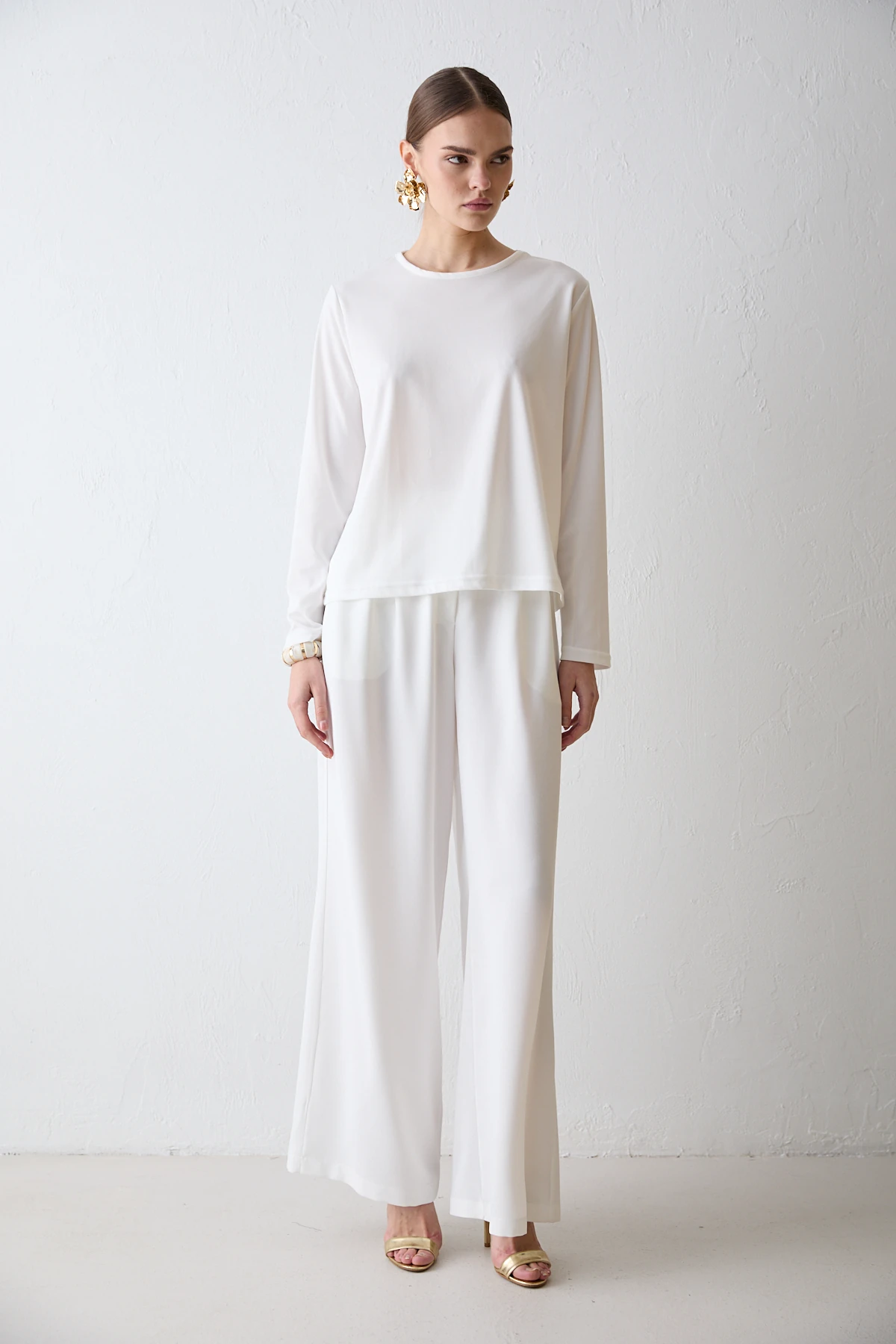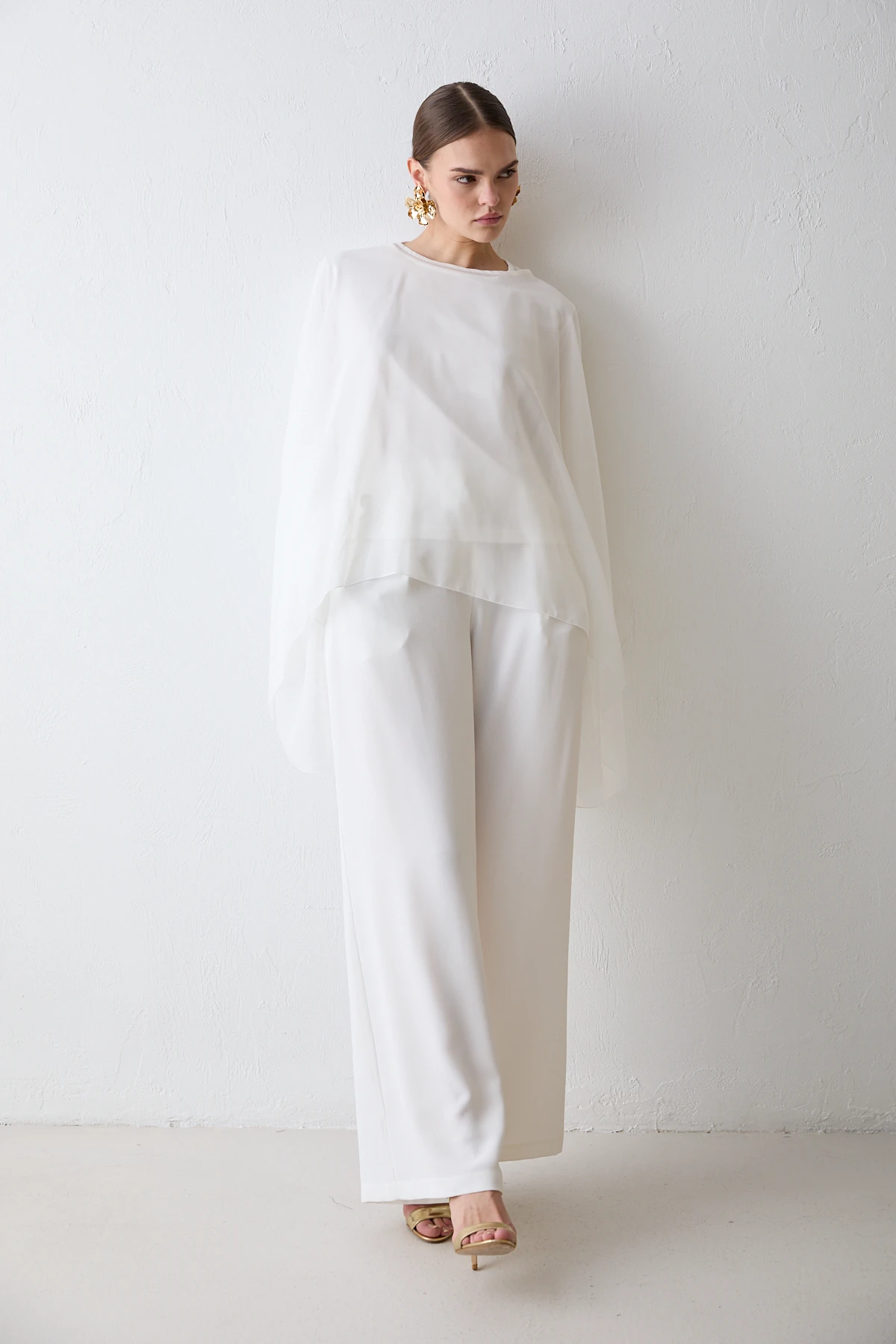 Bisiklet yaka şifon tunik ve içindeki seyyar denye badi ile birlikte sunulan takım, hafif ve katmanlı yapısıyla zarif bir görünüm oluşturur. Şifon tuniğin kol ucu dikili formu ve pantolonun önü düz, arkası lastikli bel yapısı ile yan cepleri günlük kullanımda konfor sağlar. Şifon, denye ve krep kumaş kombinasyonu modeli hem şık hem rahat bir forma kavuşturur.
